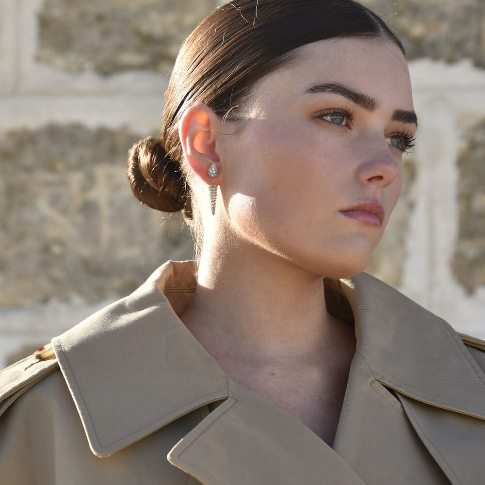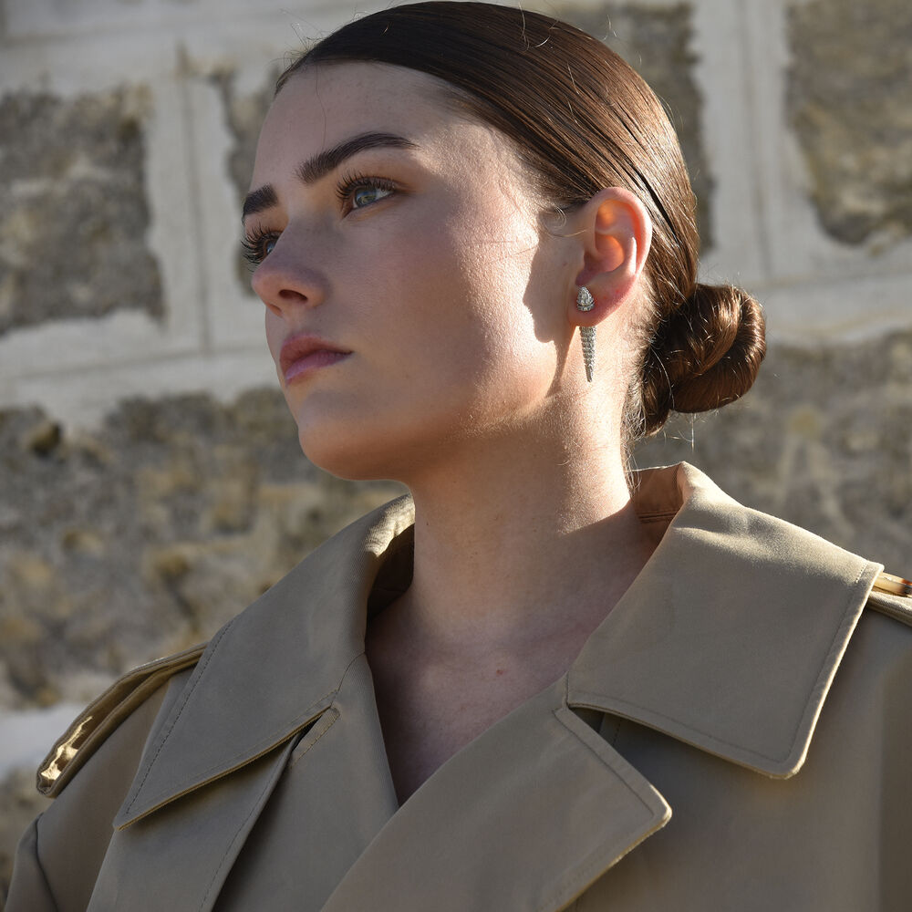 Add instant edge to any outfit with these solid silver spikes. Introducing Austen Diamante Thorn Earrings - where sharp lines meet a full sparking shimmer. This design features solid sculptural diamante spikes fully adorned with Austrian zirconias. The tip (head) of the spike serves as a stud whilst the longer tail of the spike serves as a statement closure. The earrings are made in environmentally friendly brass with silver plating for a sleek and elegant finish. Fierce, modern, and effortlessly bold, they make a perfect balance of edge and elegance.