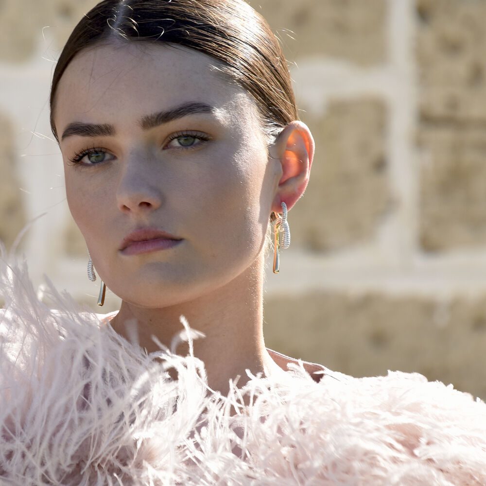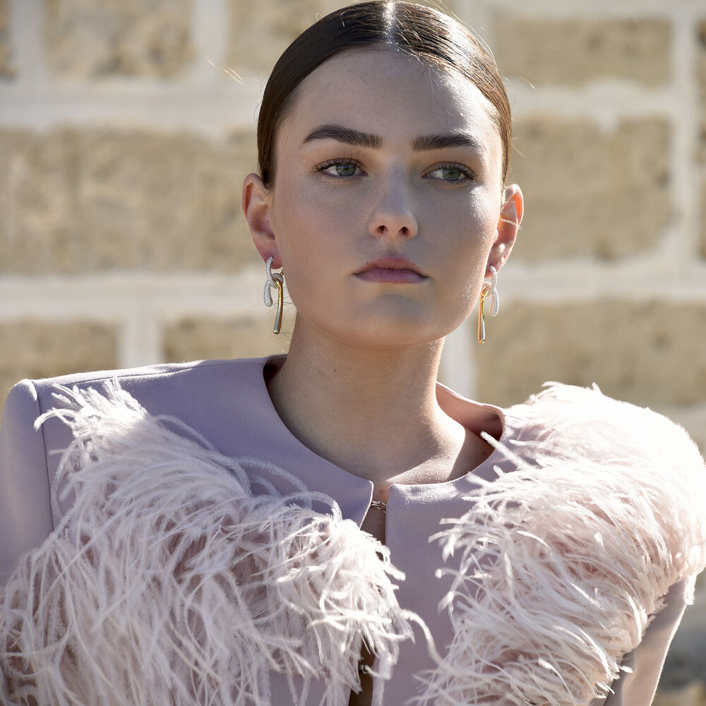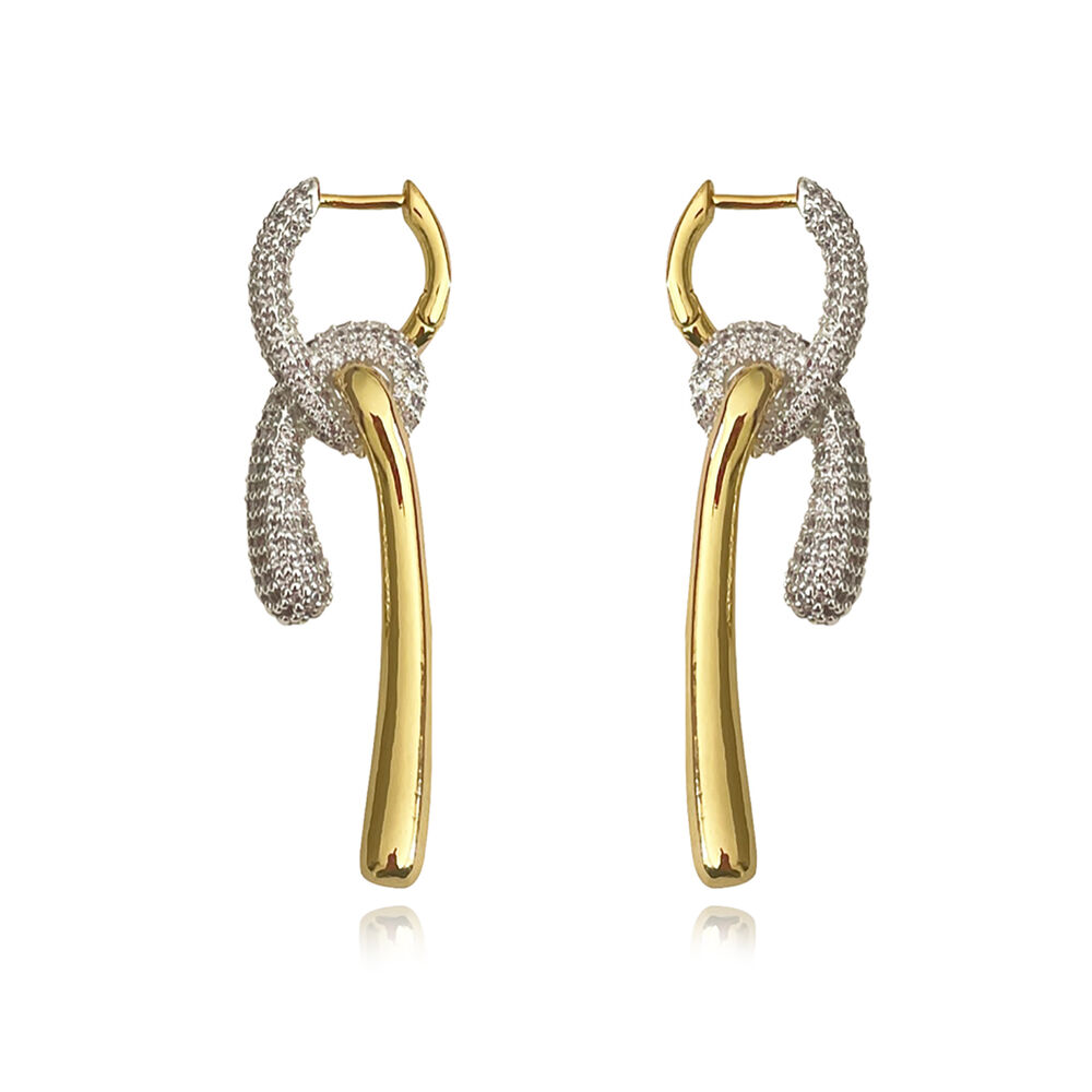 There are always knots you do not wish to untie. Introducing Aviva Two Tone Diamante Knot Earrings - a creative and second-glance-worthy ear love for those who have the eyes for something unique and innovative. A flowing metal sculpture with two drop ends, one wrapped around the other. This design embodies the spirit of strength in softness and adaptation. The earrings are made in environmentally friendly solid brass with 18K gold plating. One strand of each earring is encased with pave Austrian cubic zirconias for a shimmer that is hard to miss. A keepsake piece made with meaning and made to last. Perfect for formal, semi-formal, dressy, modern, creative, chic, layering, smart causal, casual style and more. Hypoallergenic, nickel, cadmium and lead free.