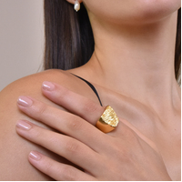 Unique art deco beauty that is uncompromisingly bold. Introducing Avyana Bold Status Open Ring - a one of a kind piece for those who value quality and uniqueness. This design is inspired by modern texture art, crafted in an irregular shape with a brushed texture. This piece is crafted in solid sterling silver with 2.5 microns of 18K gold plating (heavy gold plating) giving the piece a luxurious gold shine. Apart from the textured features on top, the rest of the ring is smoothly polished. Perfect for exquisite, creative, contemporary and high-end styling. Hypoallergenic, nickel, cadmium and lead free. Featured in Melbourne Fashion Week.
