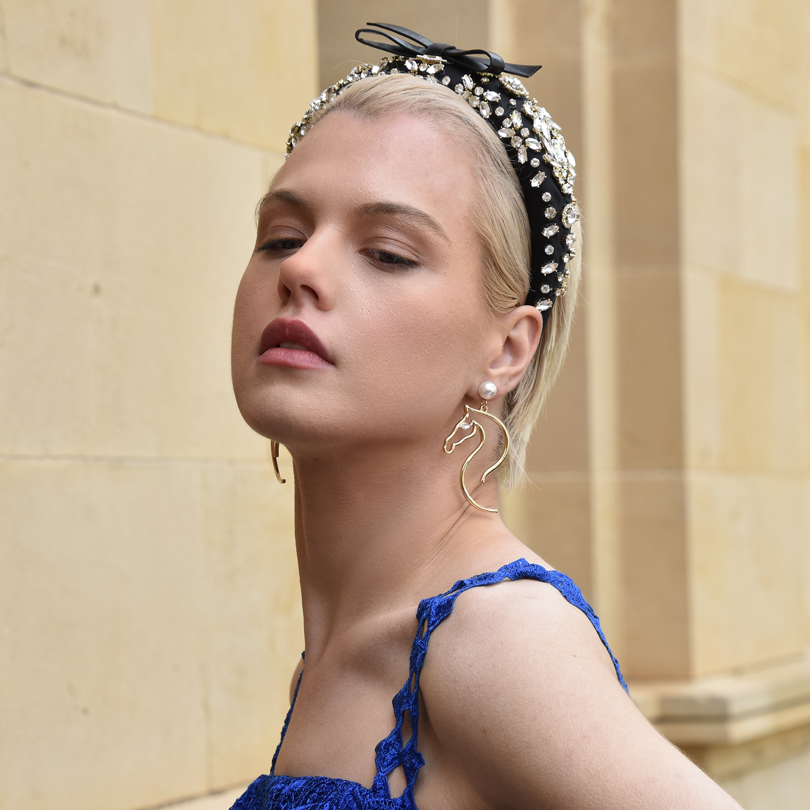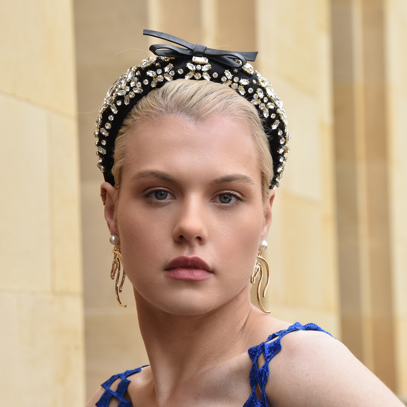 Magazine cover style high fashion luxury headband (Black) Length 17.5cm, Width 15cm, Weight 50g Also available in pink.