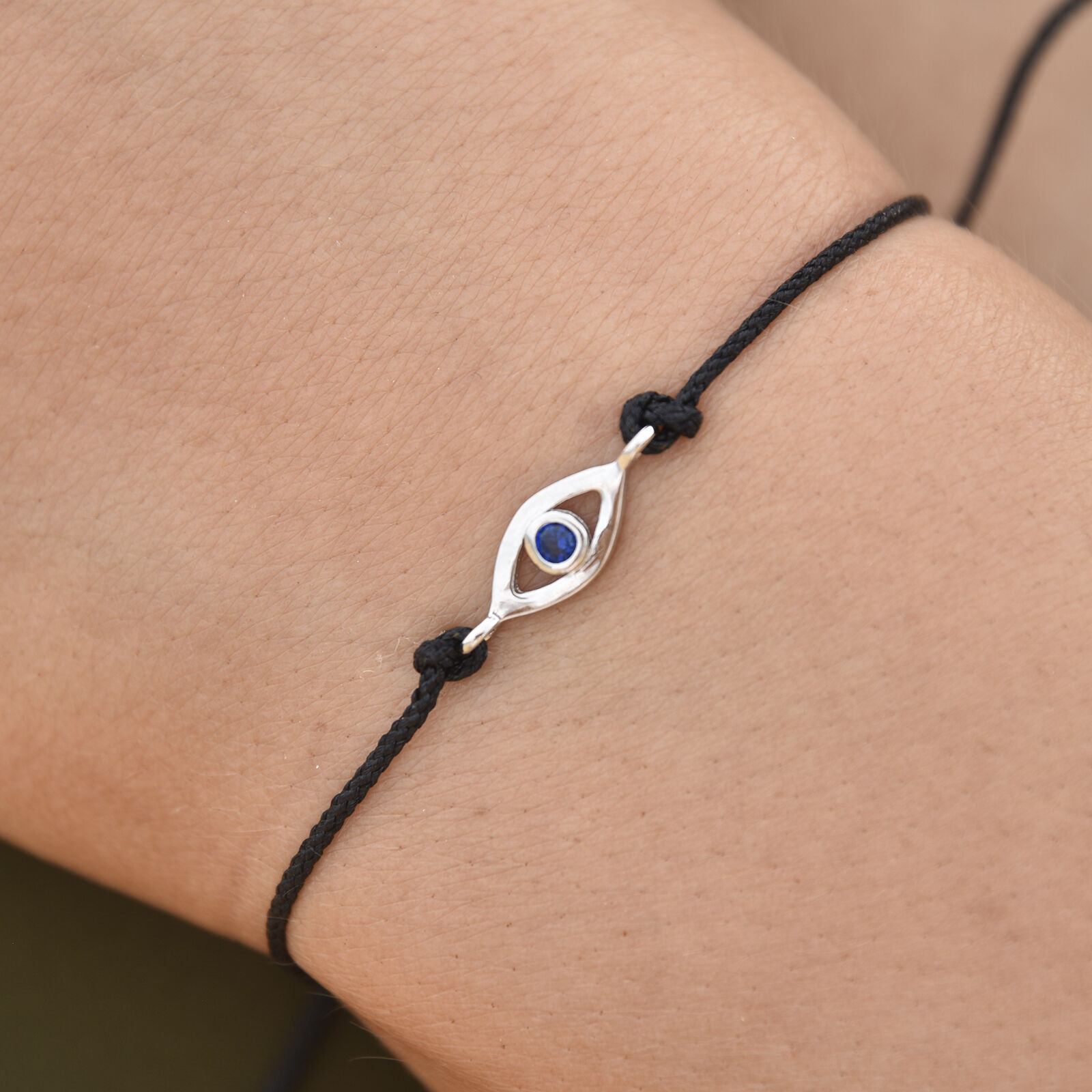 May this evil eye protect you as you go about your day. May happiness surround you and stay out of harm’s way. Introducing Aysun Gold Evil Eye Bracelet (Black String) - a versatile and gender-neutral piece featuring a silver evil eye charm adorned with a blue Austrian zircon. The evil eye charm is made in sterling silver for enduring and hypoallergenic everyday wear. Perfect for layering and all personal styles, and especially for evil eye lovers. This bracelet comes with an adjustable string knot for a preferred personal fit.