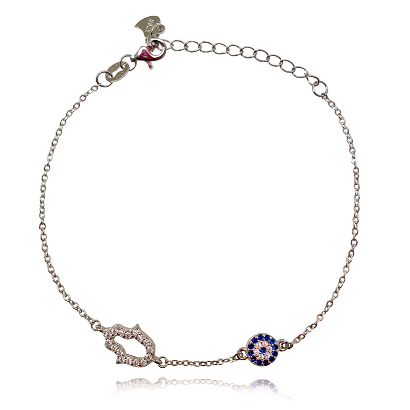 May this evil eye protect you as you go about your day. May happiness surround you and stay out of harm’s way. Introducing Azra Luck Evil Eye Bracelet (Silver) - a delicate and chic fine piece featuring a round blue zircon evil eye and a hand evil eye embellished with quality Austrian cubic zirconias. This bracelet is made in sterling silver for enduring and hypoallergenic everyday wear. Perfect for layering and all personal styles, and especially for evil eye lovers. This bracelet is 20.5cm long including a 4.5cm adjustable link for a more flexible personal fit. Hypoallergenic, nickel, lead, and cadmium free. Available in 18ct gold or silver or 18ct rose gold.