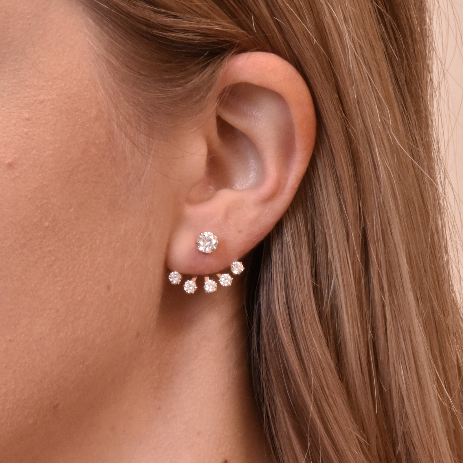 Wear the magic twinkle on your ears! Artistically and delicately crafted using 18K rose gold plated titanium steel and cubic zirconia, Benicia Rose Gold Stud Earrings are your perfect choice to strike a timeless, feminine, luxurious and classy look! Glamorous with a refined delicacy, this unique pair will 'up class' your daily styling in no time! This design is crafted in titamium steel with 18K rose gold plating, embellished with gorgeous clear zircons. Perfect for weddings, bridal looks, bridal showers, engagement parties and any formal to semi formal occasions. At the meantime, this design also suits simple, modern and contemporary looks with a classy tint and twinkle.