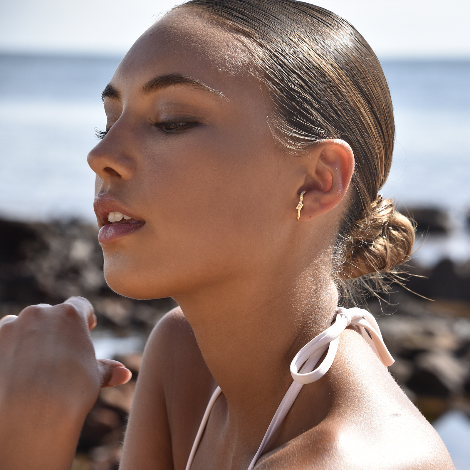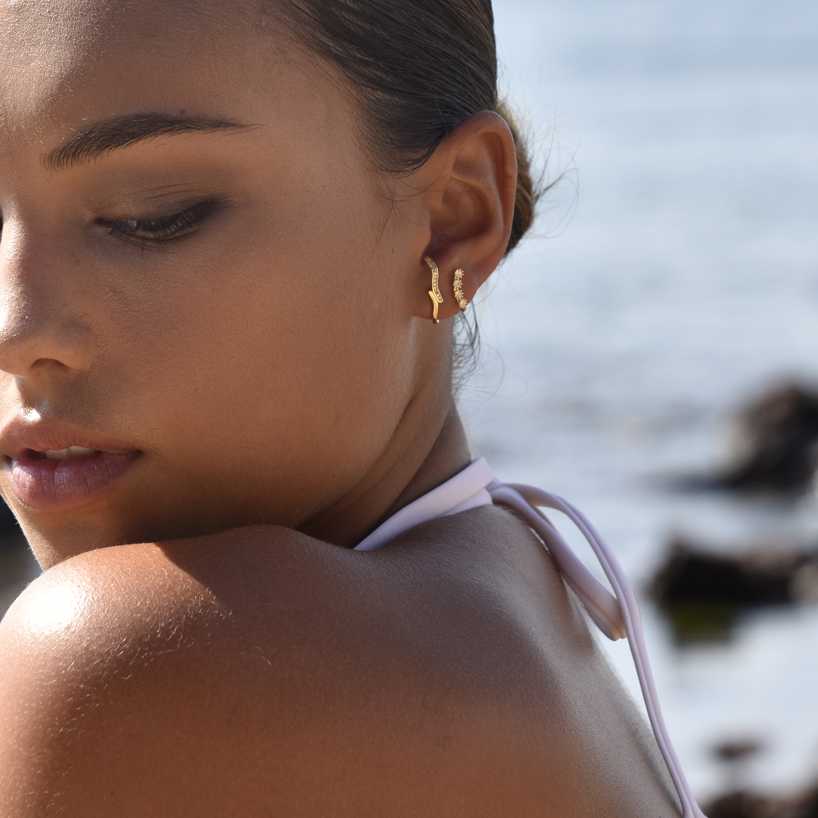 Modern, artsy and unique. Introducing Berte Artsy Ear Hook Stud Earrings (Gold) - a delicate and unique ear stud for a subtle shimmer and curl. This design features two curved lines vertically aligned and connected in the middle, with the top section fully embellished with a row of Austrian zirconia diamantes. The earrings are made in solid sterling silver with 18K gold plating for a lasting and noble gold shine. Perfect for modern, artsy, creative, minimalist, earring layering, chic, smart casual, casual styles and more. Hypoallergenic, nickel, lead, and cadmium free.
