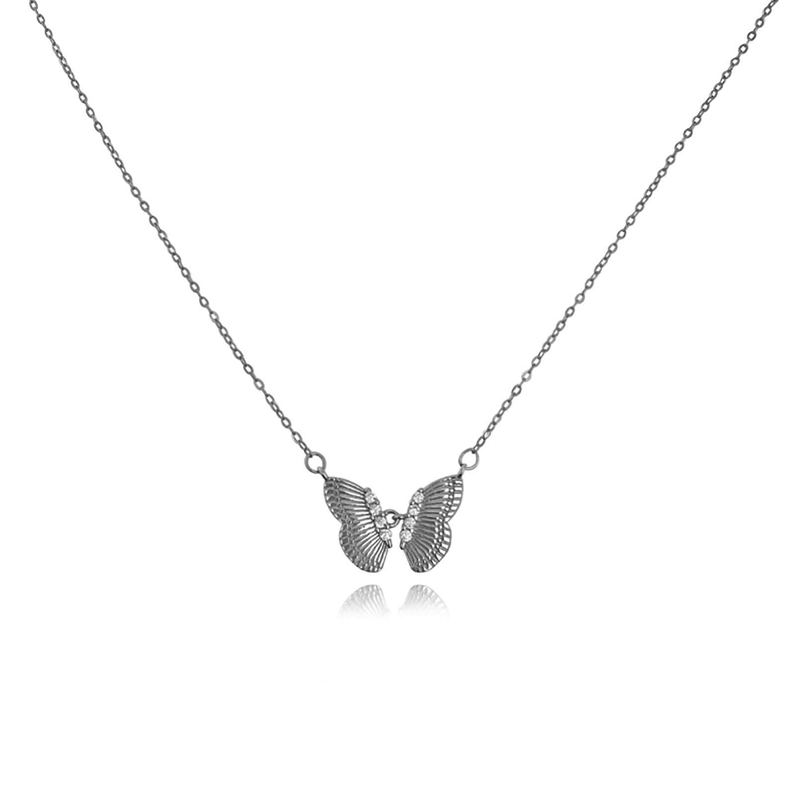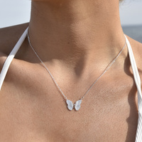 Embrace and excel in each new phase of life. Introducing Bindi Interlinked Butterfly Pendant Necklace (Silver) - a unique, creative and chic butterfly neckpiece to enhance the beauty of each stage of life. This design features an interlinked butterfly pendant adorned with clear Austrian diamantes in the middle. This neckpiece is created in sterling silver with precious white rhodium plating for hypoallergenic and endure wear. Available in 18ct gold or silver. Suitable for chic, dainty, feminine, timeless, smart casual, casual, necklace layering, everyday style and more. Hypoallergenic, nickel, lead, and cadmium free.