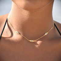 Chic, refined and versatile for styling. Introducing Birdie Evil Eye Necklace / Choker (Gold) - a fine style evil eye necklace perfect for layering and everyday wear. This design features 3 evil eye pendants embellished with Austrian clear and blue zirconias, exuding fine sparkles especially in the sunlight. This neckpiece is made in sterling silver with 18K gold plating. This neckpiece is 45cm long including a 10.5cm long adjustable link, allowing it to be worn in your preferred length. Perfect for modern, bohemian, coastal, chic, layering, smart causal, casual and everyday styles. Hypoallergenic, nickel, lead, and cadmium free.