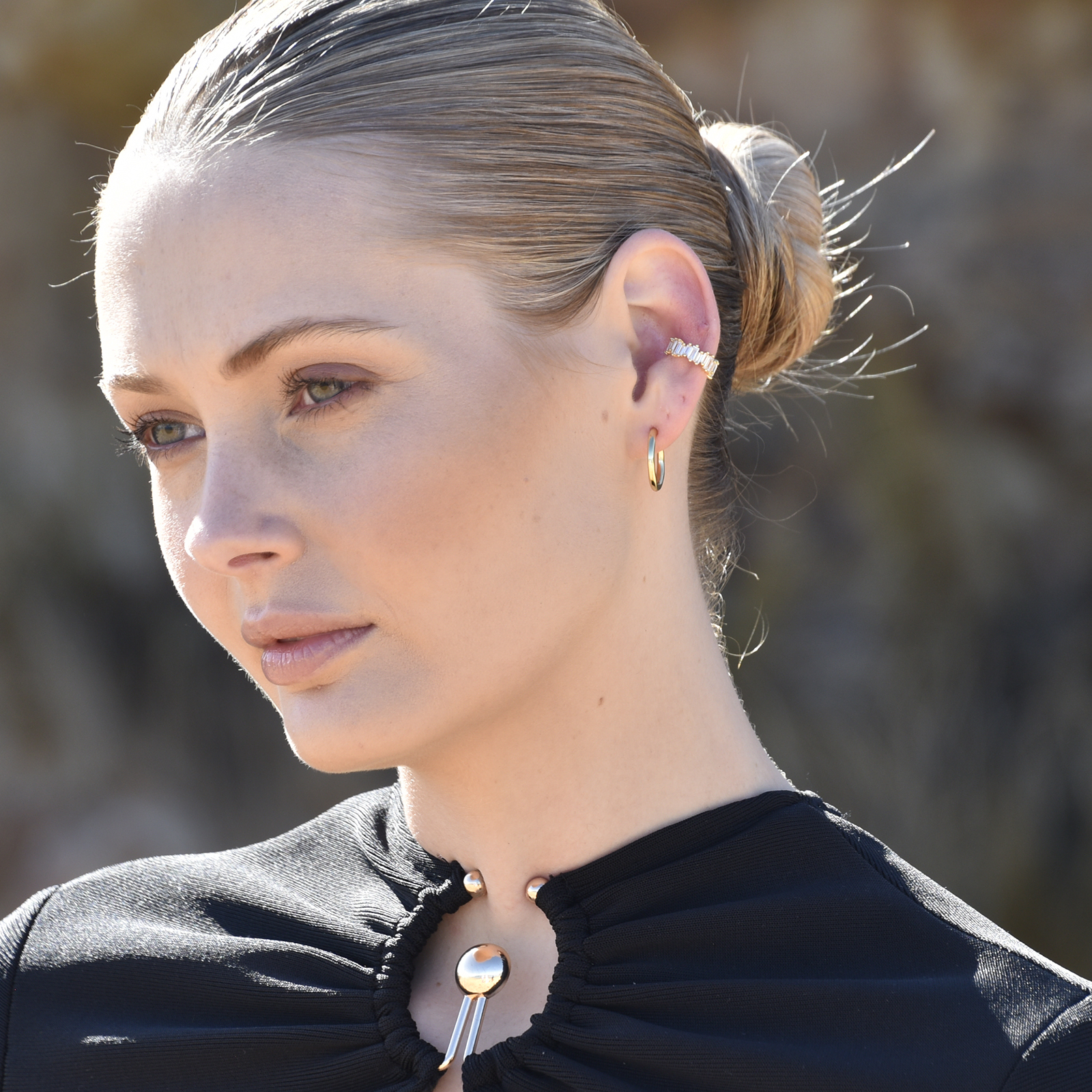 Eye-catching and chic ear cuff with a subtle glamour. Introducing Bria Austrian Zircon Cuff Earrings (Pair) - a unique and stunning diamante style ear cuff with a light luxury. This design features Austrian zircon embellished ear cuffs made in solid sterling silver and 18K gold plating for hypoallergenic and enduring wear. Due to the softness of solid sterling silver, this ear cuff can be easily adjusted manually for the perfect fit on your ear. It is recommended to wear this cuff on your ear helix area. Perfect for modern, artsy, creative, earring layering, chic, glamour, dressy, smart casual, casual, everyday styles and more. Hypoallergenic, nickel, cadmium and lead free.