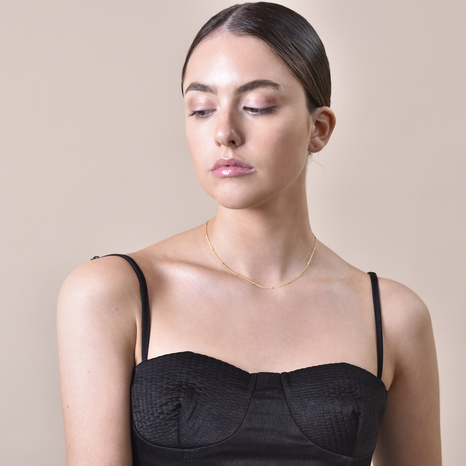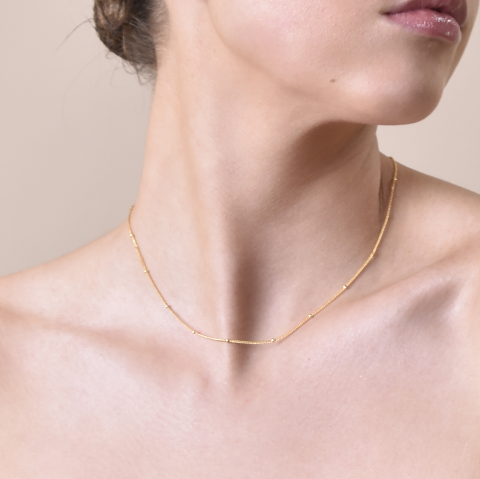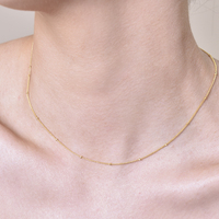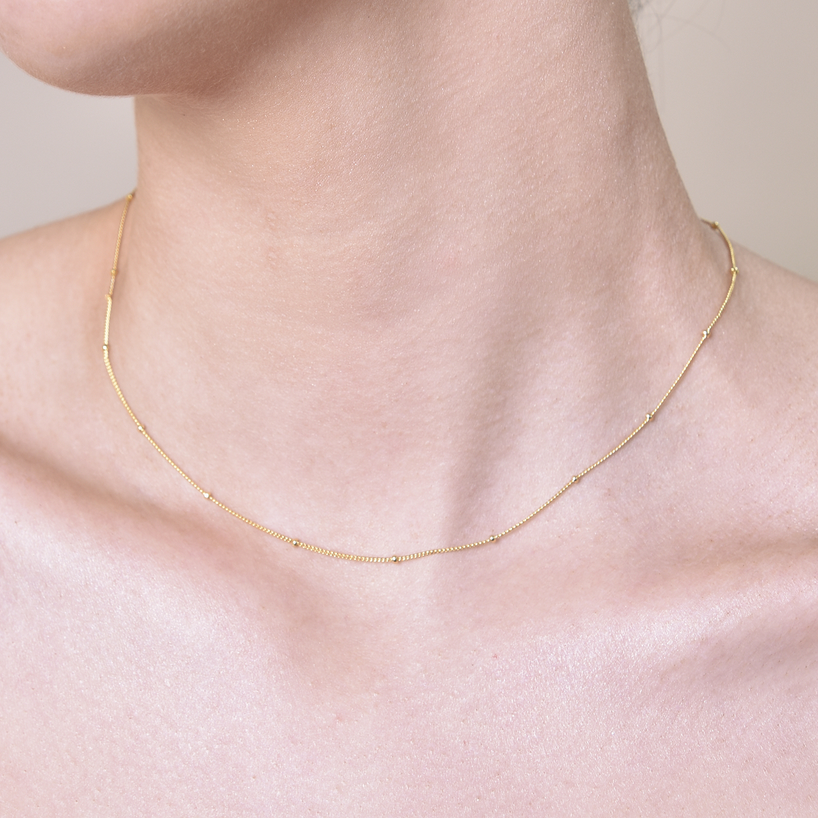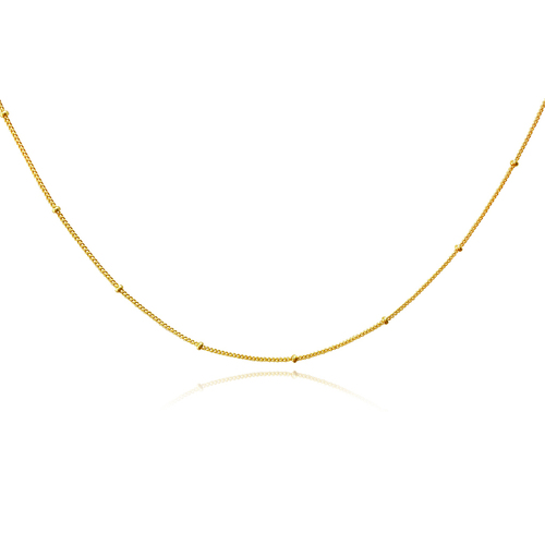 Fine beauty with subtle details. Introducing Brianna Fine Gold Bead Necklace - an everyday style fine neck love for women and girls of all ages. This design features a delicate gold necklace with gold beads evenly spaced along the chain. This neck piece is made of solid sterling silver with 18k gold plating for hypoallergenic and durable wear. It is 40cm long including 5cm adjustable link for your best personal fit. Suitable for all personal styles, everyday wear and necklace layering. Hypoallergenic, nickel, cadmium and lead free. Note that the length model wears is 40cm.