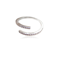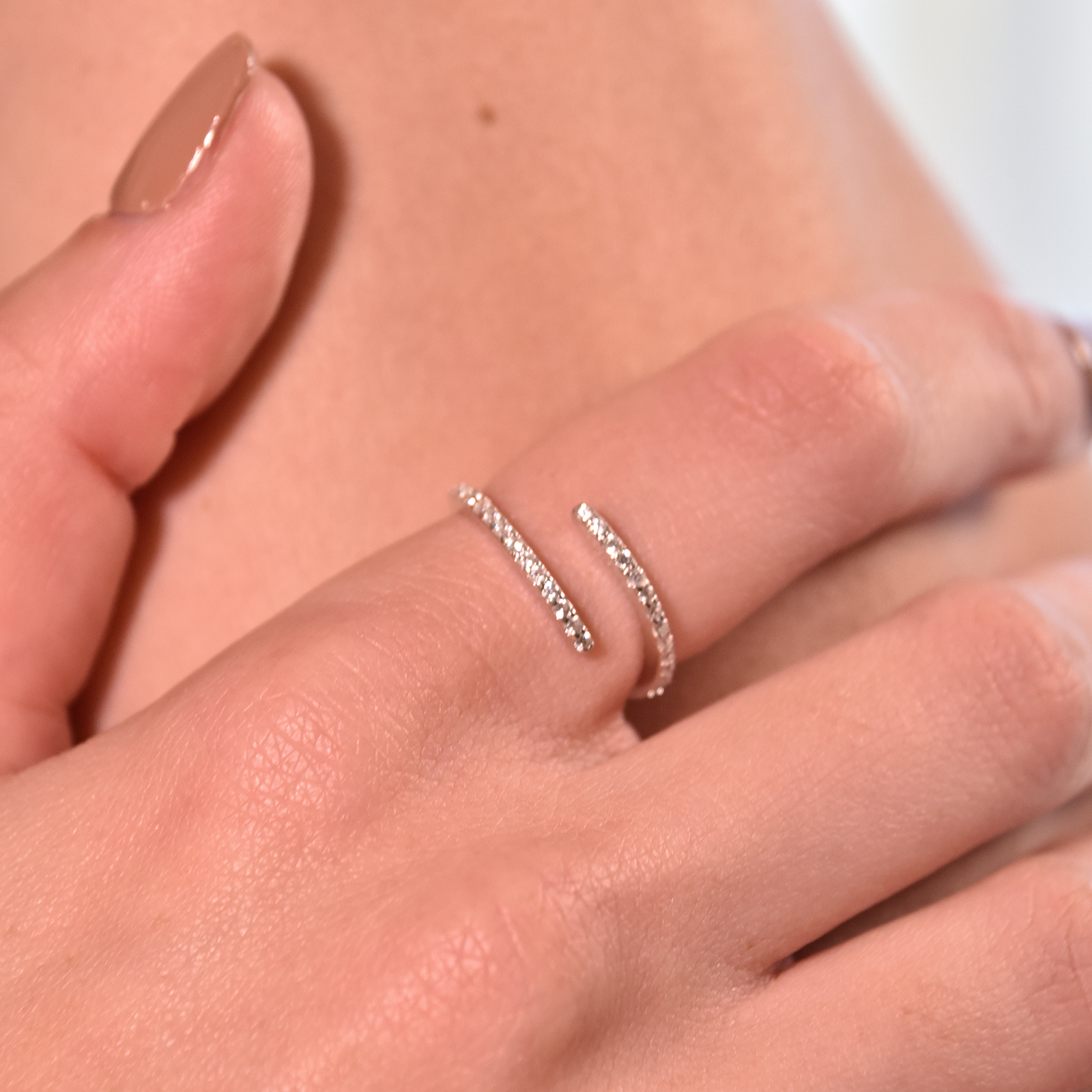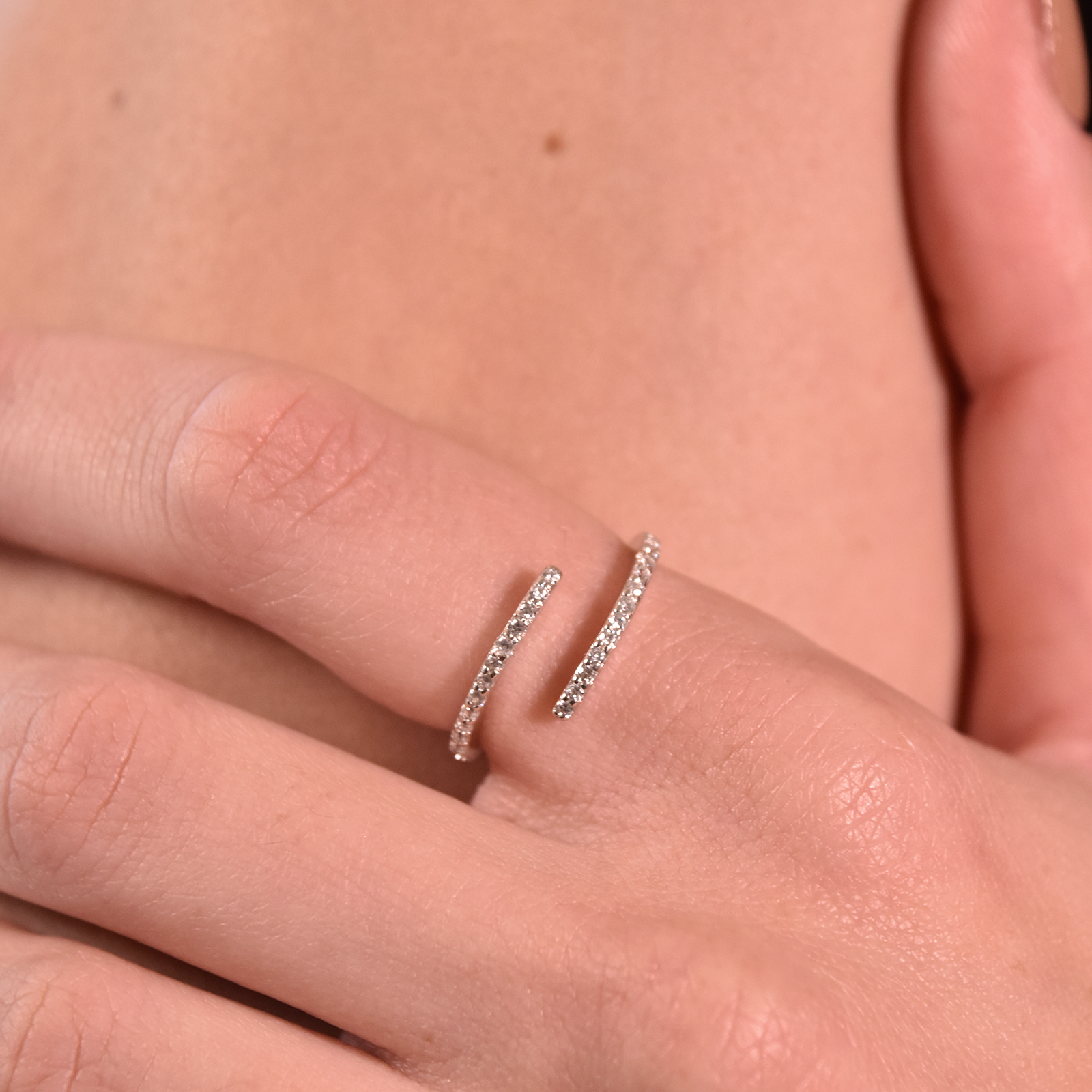 Delicate, fine and details rich. Introducing Brielle Fine Zirconia Wrap Open Ring - a contemporary style silver ring for women and girls of all ages. This design features a wrap-around style ring band embellished with quality cubic zirconia. The ring is crafted in solid sterling silver. It can be easily adjusted manually for the best fit. Perfect for modern, minimalist, ring stacking, casual, everyday styles and more. Hypoallergenic, nickel, cadmium and lead free.