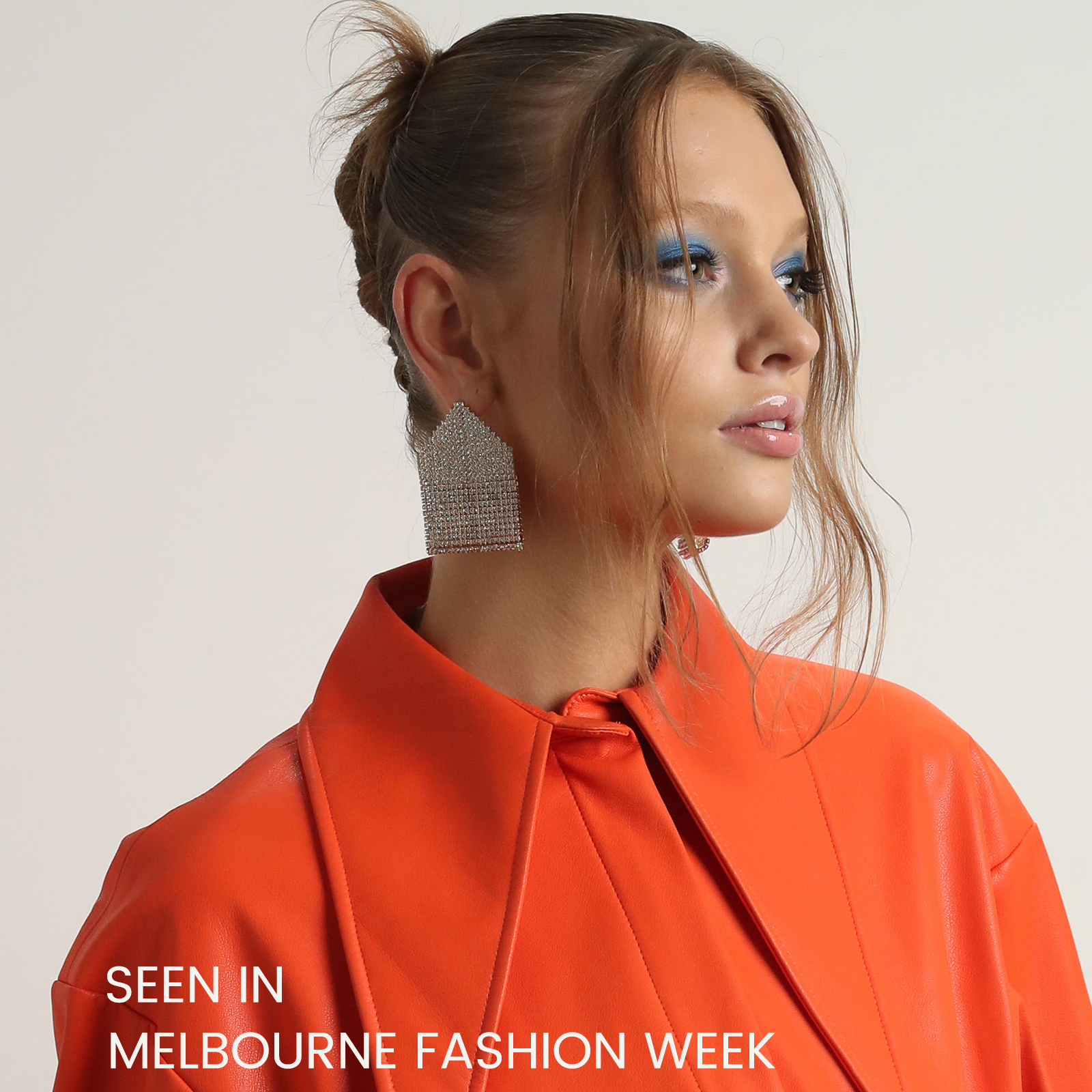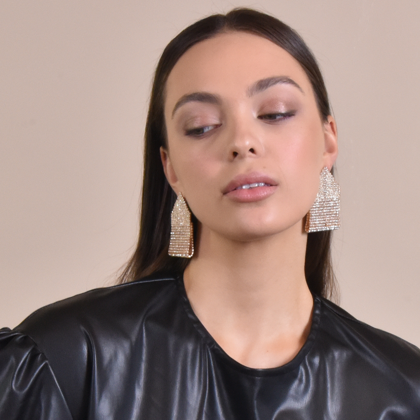 Sold OutExtravagantly elegant with full diamante shimmer. Introducing Brighton Runway Style Diamante Drop Earrings — an eye-catching catwalk style statement ear love for your uncompromising high fashion attitude. This unique design features folded diamante ‘stripes’ in 14K gold, adding a full diamante glamour to your elevated styling. An unusual, slightly rebellious, outspoken, and creative style for those who dare to wear. Featured in Melbourne Fashion Week.