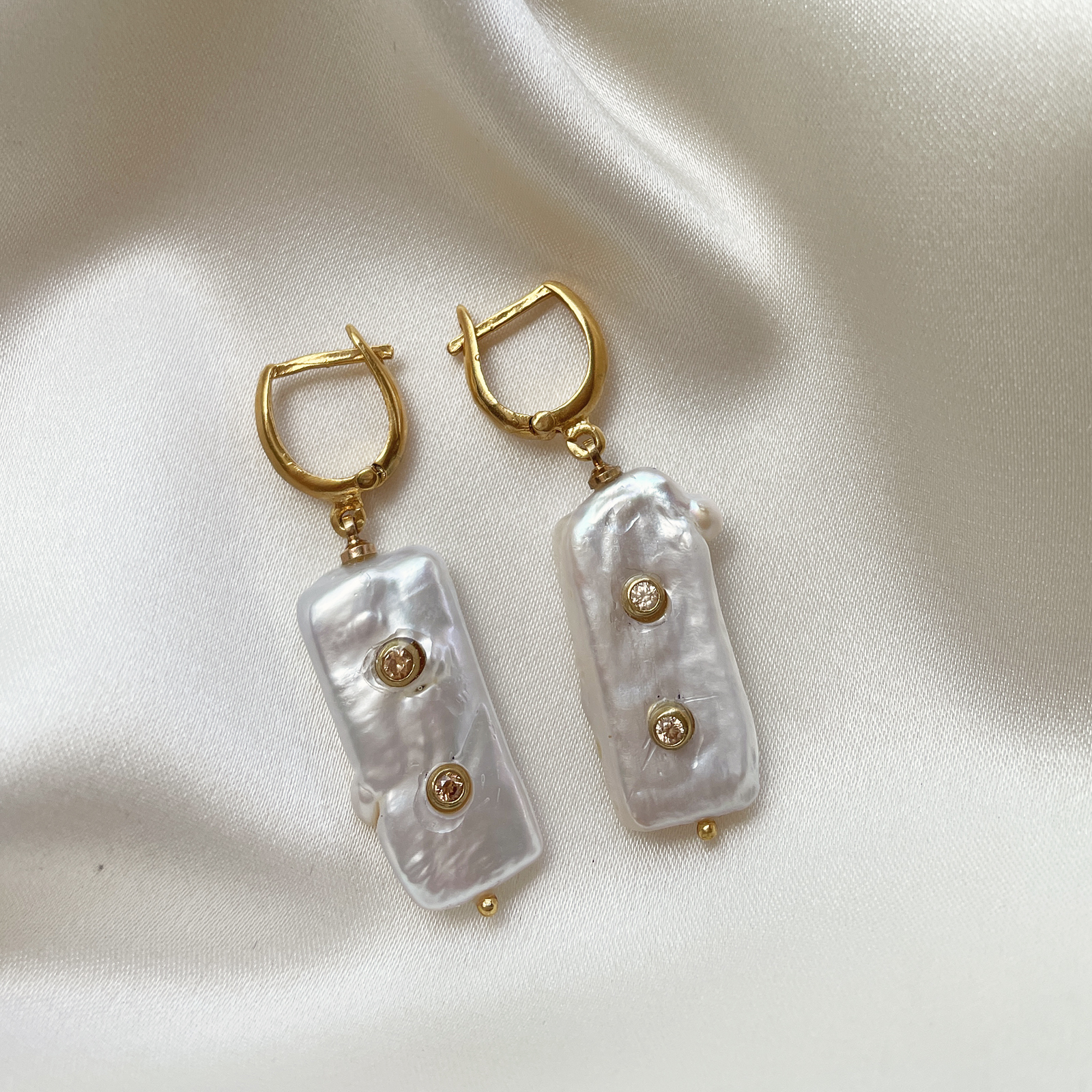 | Made from: | Champagne-toned ZirconiaNatural Freshwater Pearls24K Pure Gold PlatingEnvironmentally Friendly Brass |