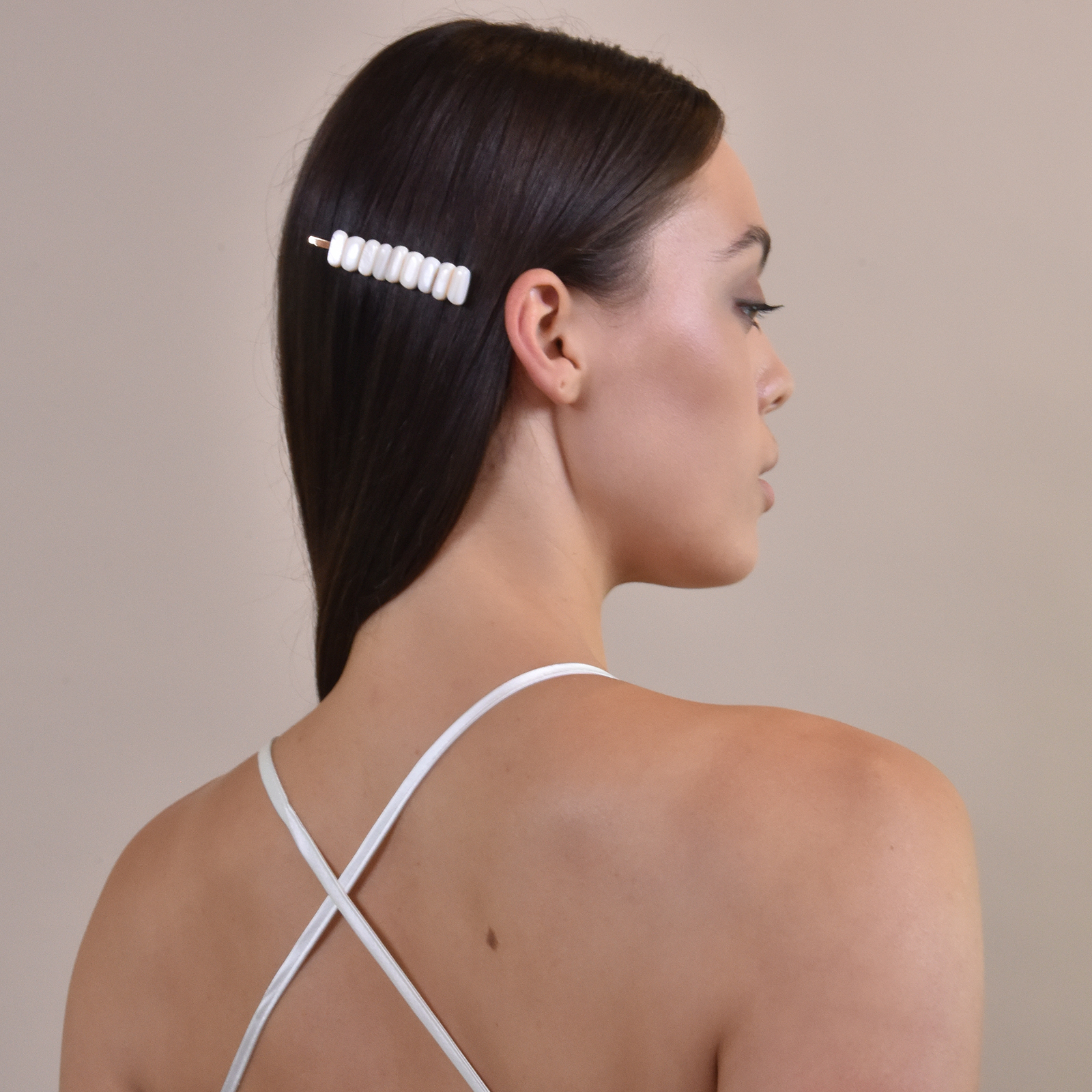 Soothing, calming and earthy. Introducing Calista Beige Muse Hair Clip — a modern coastal style barrette for a relaxed and elevated touch. This piece features 9 pieces of beige resin blocks neatly lined up on a gold-coloured hair clip. Perfect for modern, retro, chic, relaxed, coastal, summer, beach, earthy, casual styles and more.