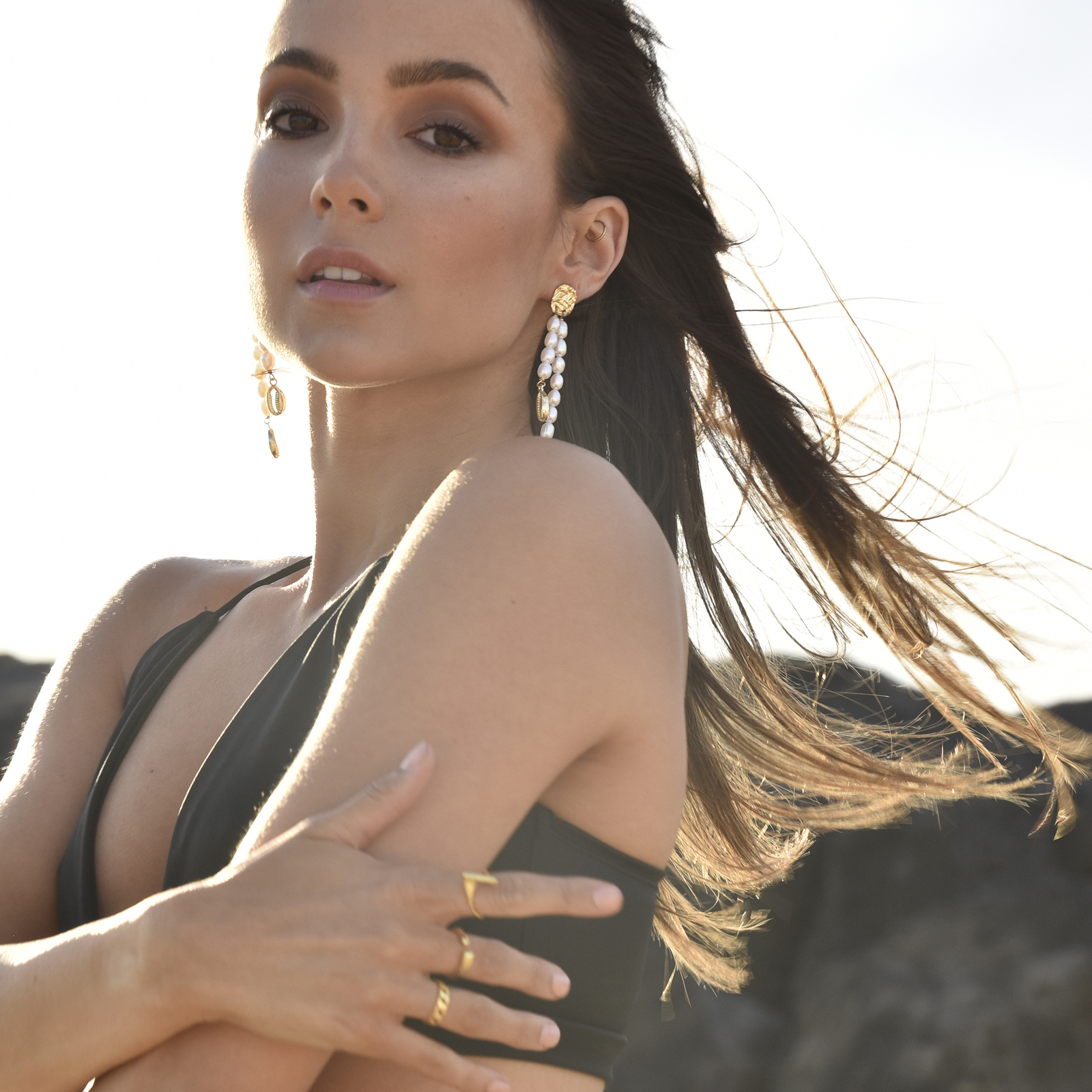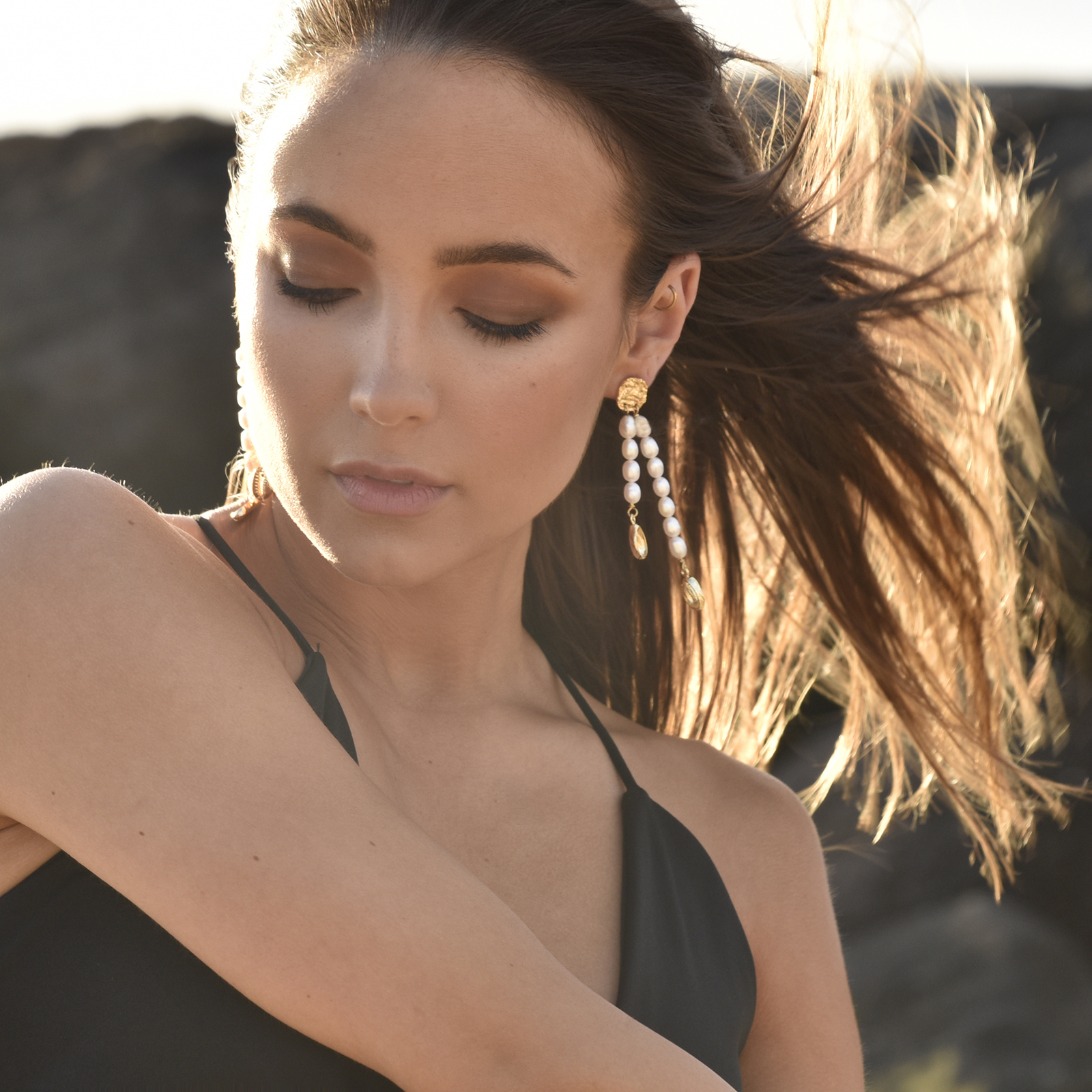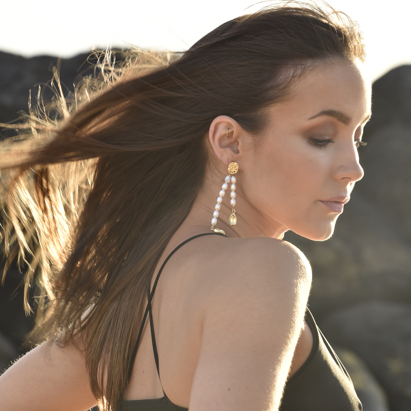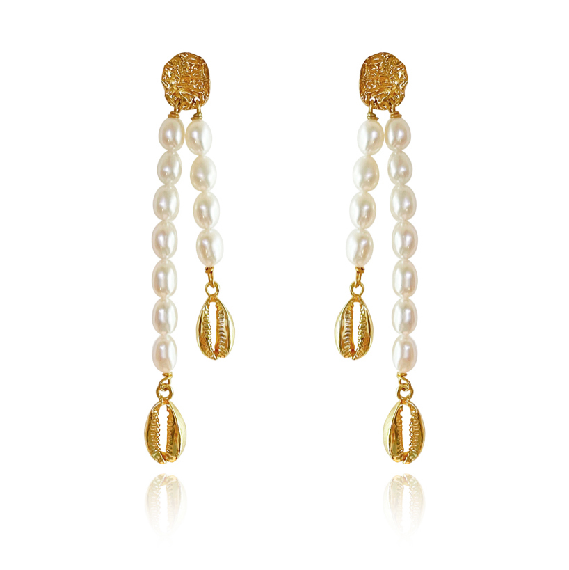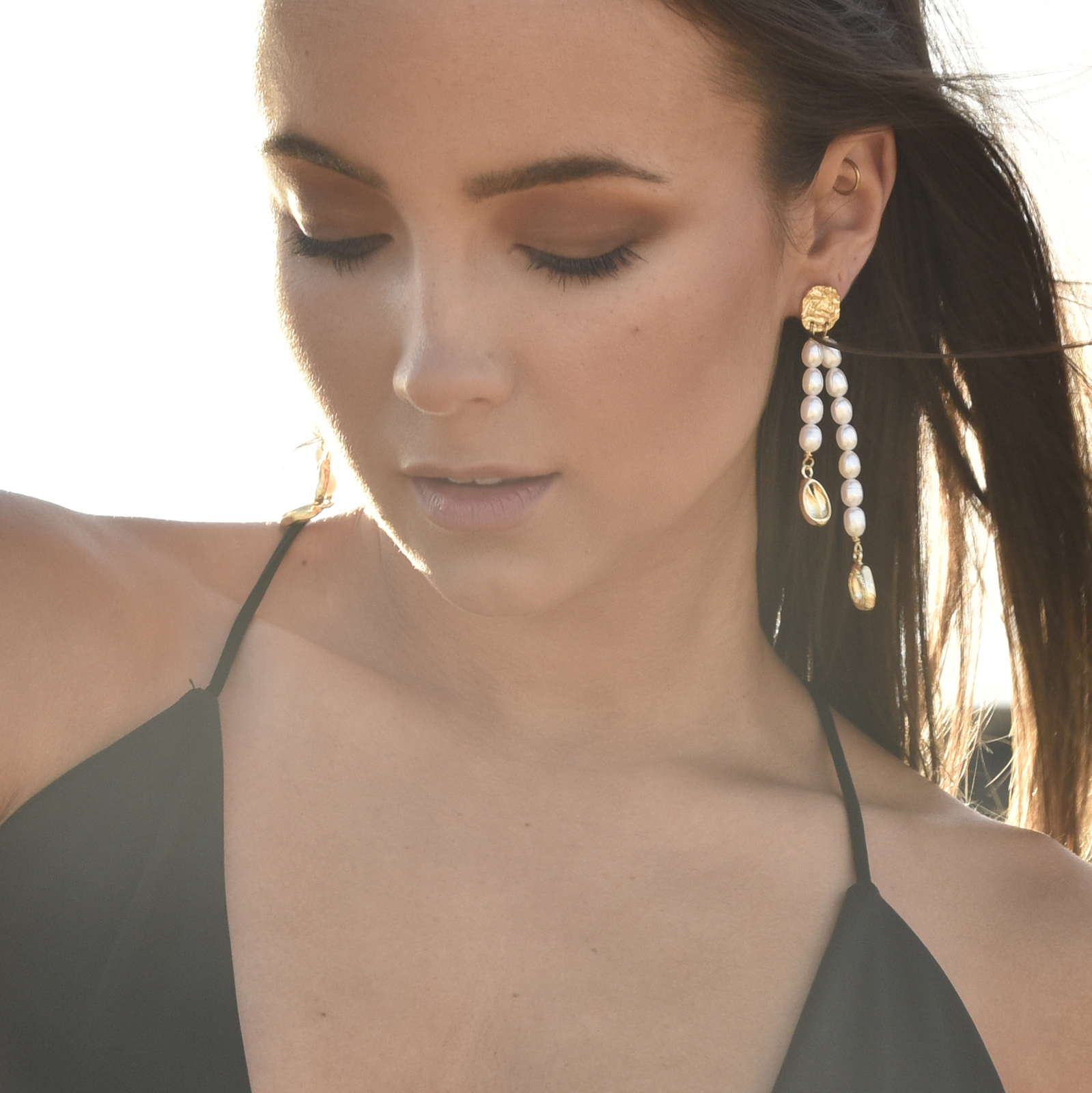 Unique, artsy, elegant yet playful. Introducing Calliope 24K Freshwater Pearl Drop Earrings - a coastal style pearl love handmade with love and passion for jewellery. This design features handmade pearl strands of different lengths, with the end of each strand adorned with 24k gold plated shells. The pearls featured in this design are premium quality Western Australia natural freshwater pearls that have smooth surface, high lustre and a gorgeous shimmer. The textual plate on the top and the gold shells are made of environmentally friendly brass (nickel free) with 2 microns of 24k pure gold plating (4 times thicker than gold plating used in average fashion jewellery). The earring posts are made of thickened solid sterling silver for hypoallergenic wear. An eye-catching and creative pearl beauty perfect for bridal, wedding, formal, semi-formal, dressy, creative fashion styling, coastal, chic, feminine, summer, beach, smart casual, casual style and more. Hypoallergenic, nickel, cadmium and lead free.