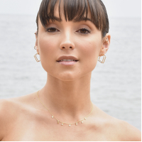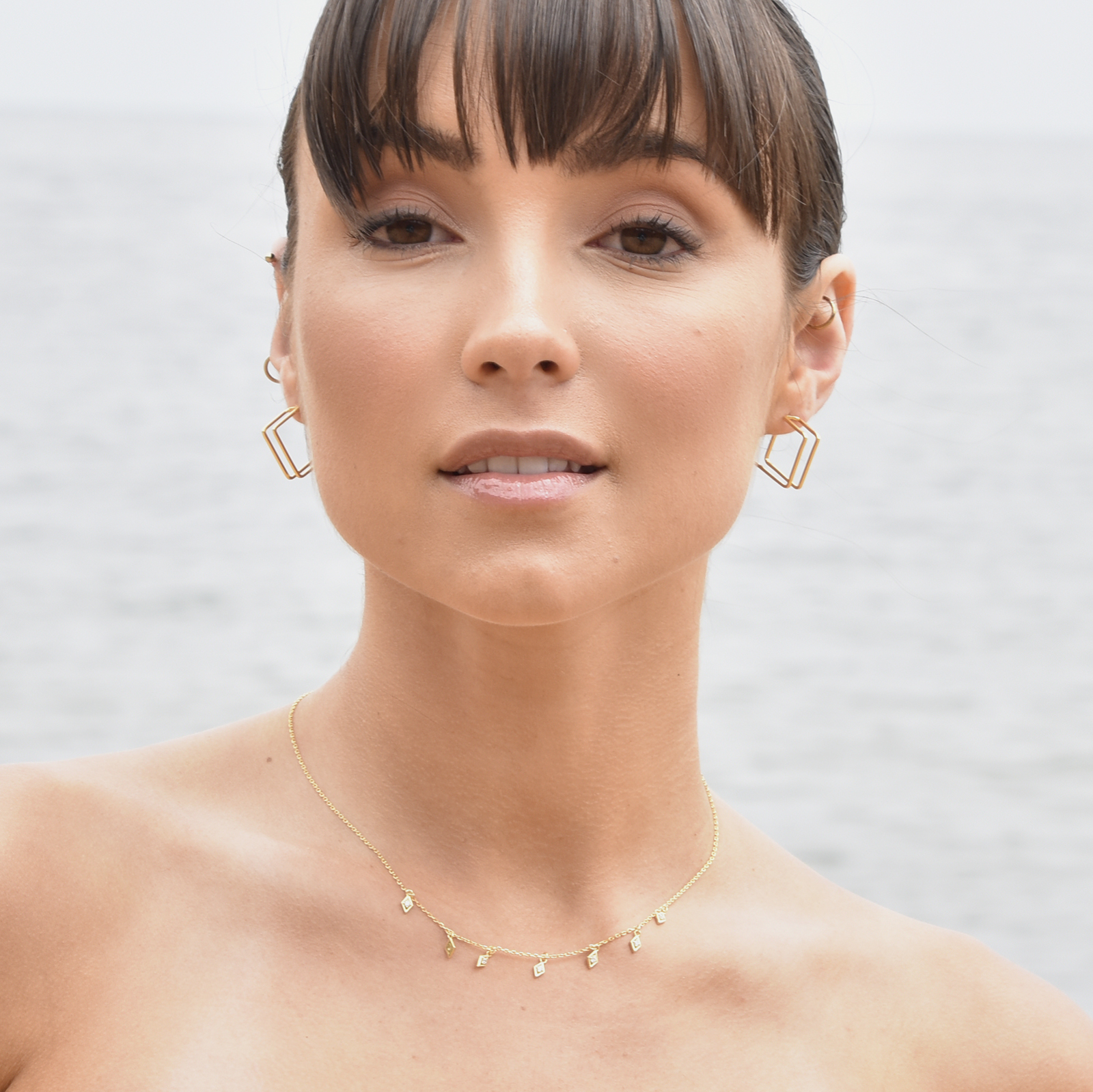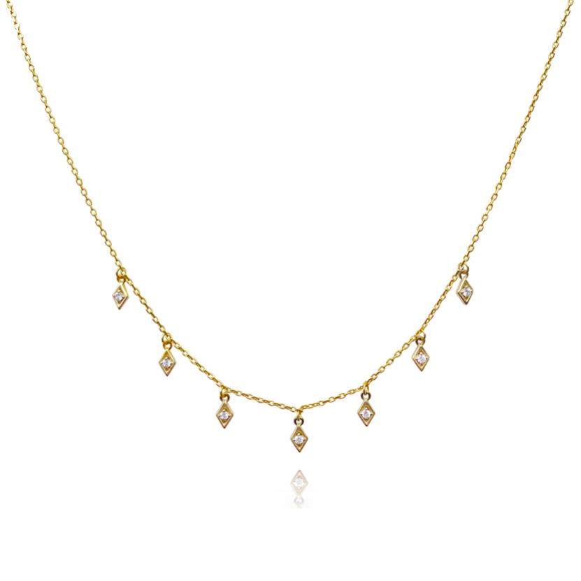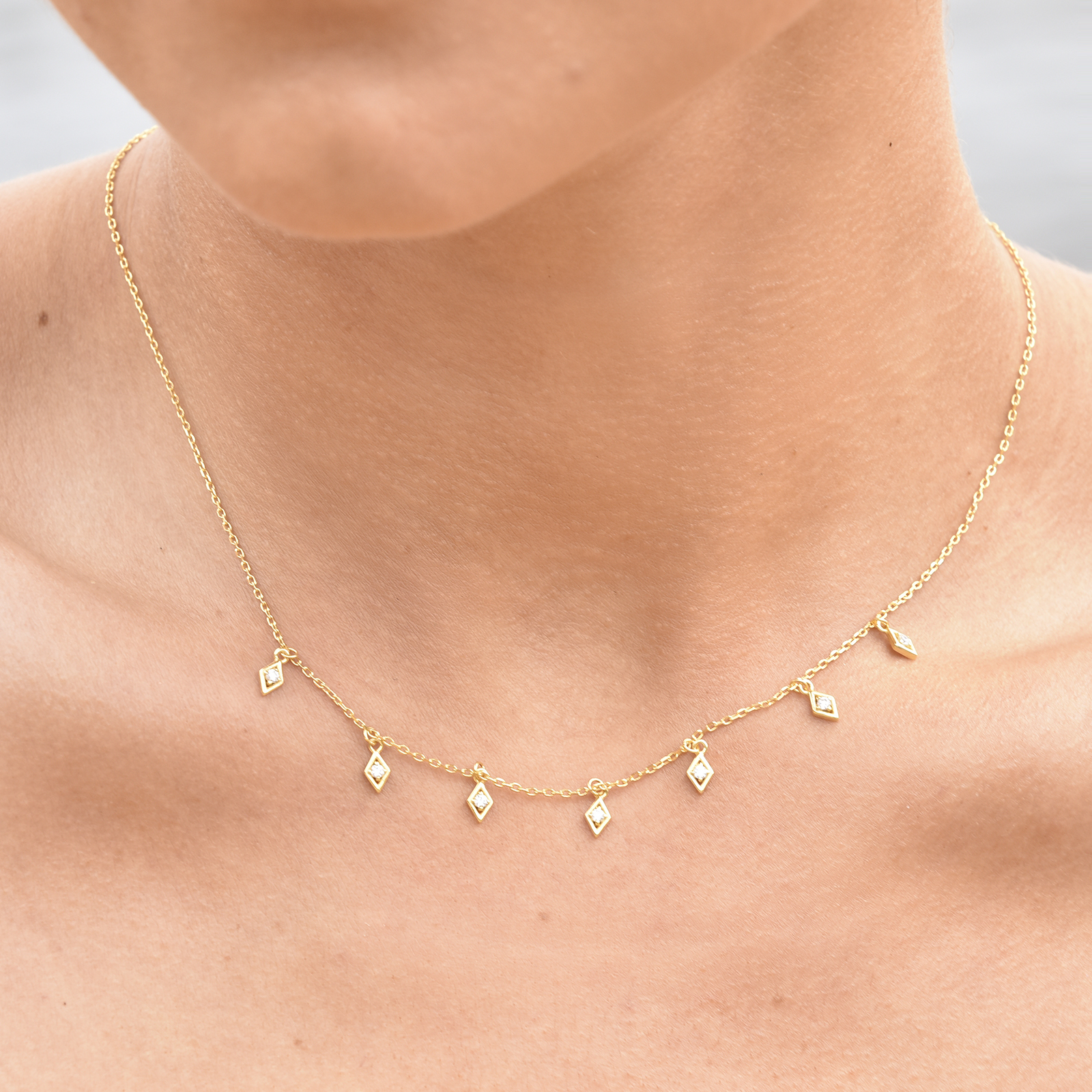 Chic, delicate and refined. Introducing Cami Dainty Diamante Necklace (Gold) - a sweet and adorable fine neckpiece for your effortless everyday styling / layering. This design features 7 diamond shaped dainty pendants evenly spaced apart on the necklace - each adorned with an Austrian zirconia in the centre. The necklace and the pendants are made of sterling silver with 18K gold plating. The necklace 44cm long including a 5cm adjustable link, allowing for a more flexible fit. Perfect for modern, retro, chic, fine, necklace layering, boho, smart casual, casual, everyday styles and more. Suitable for teens. Hypoallergenic, nickel, cadmium and lead free.