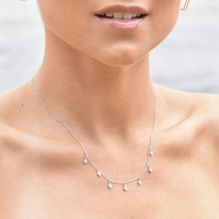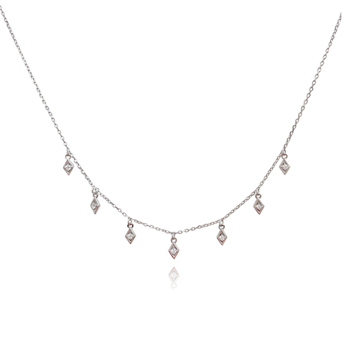 Chic, delicate and refined. Introducing Cami Dainty Diamante Necklace (Silver) - a sweet and adorable fine neckpiece for your effortless everyday styling / layering. This design features 7 diamond shaped dainty pendants evenly spaced apart on the necklace - each adorned with an Austrian zirconia in the centre. The necklace and the pendants are made of sterling silver. The necklace 44cm long including a 5cm adjustable link, allowing for a more flexible fit. Perfect for modern, retro, chic, fine, necklace layering, boho, smart casual, casual, everyday styles and more. Suitable for teens. Hypoallergenic, nickel, cadmium and lead free.