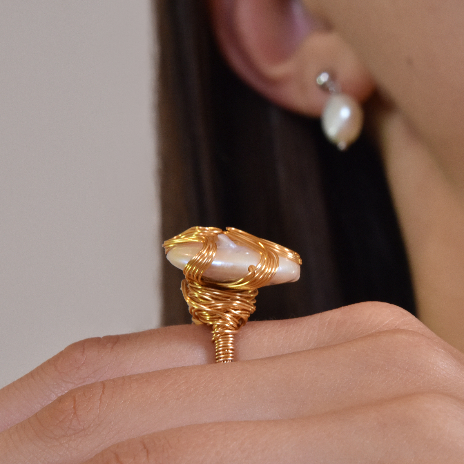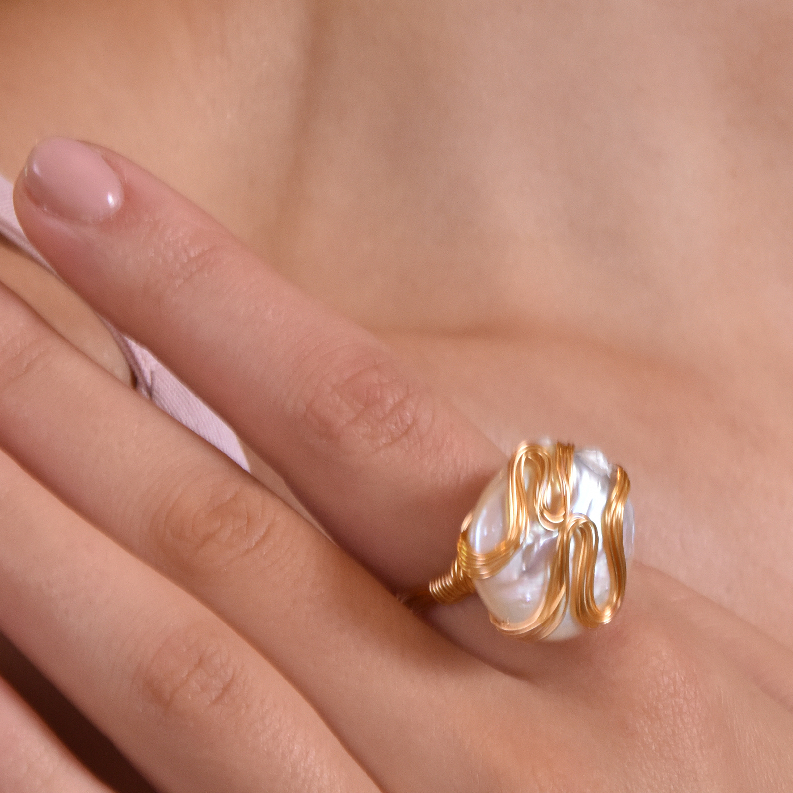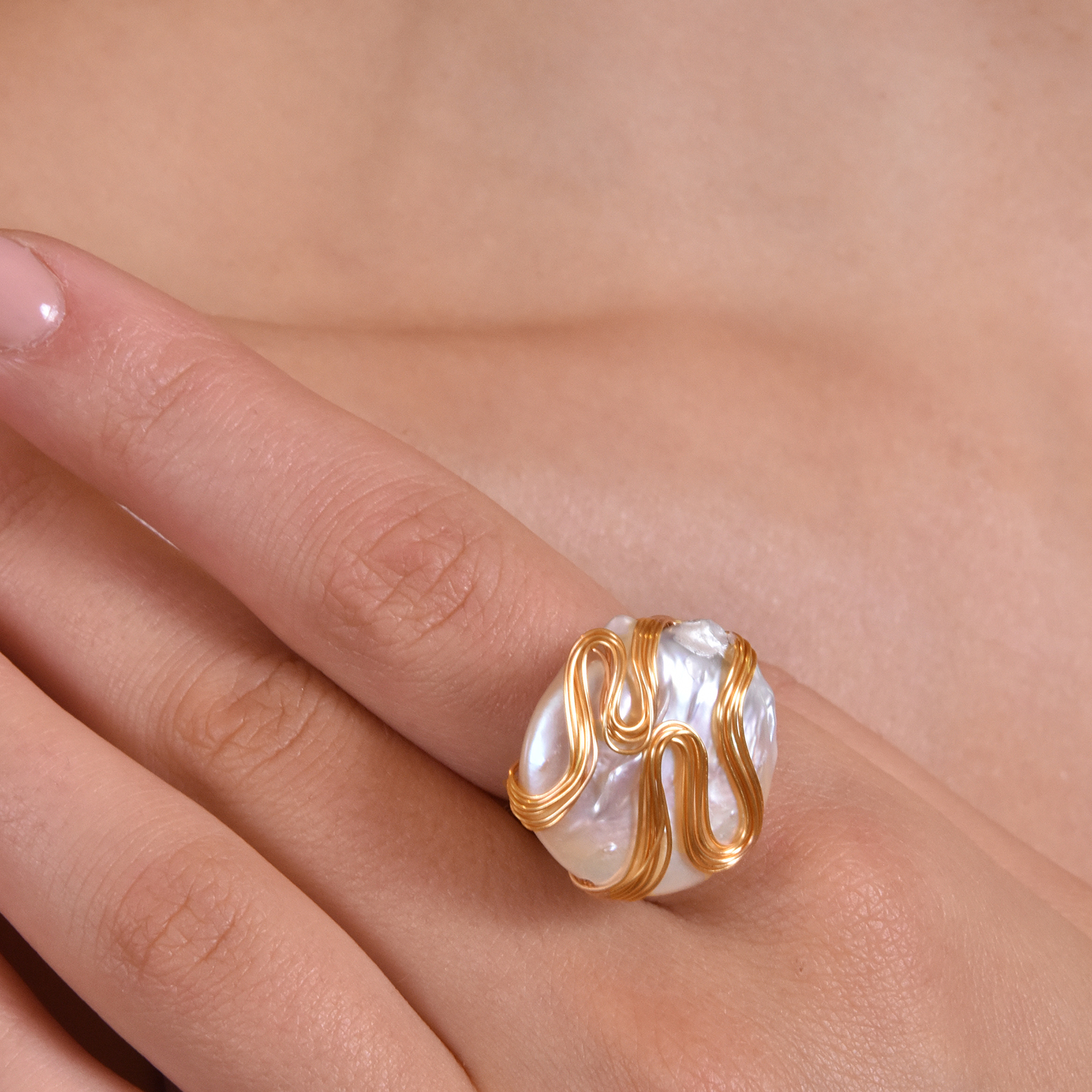 Pearl extravagance with a bold elegance. Introducing Capriana 24K Gold Baroque Pearl Nest Ring — an artisan handcrafted pearl art for lovers of quality and uniqueness. This ring features a large flat baroque pearl with authentic textures and stunning lustre, handwired with gold wires made of environmentally friendly brass (nickel free) with 24K pure gold plating. The wires on the pearl surface are artistically formed in curves and flows, adding movement to the stillness. This ring comes with a fully enclosed gold wire band that can be slightly twisted to adjust the fit (see adjusting demonstration video). Perfect for formal, semi-formal, modern, retro, coastal, extravagant, timeless styles and more. Hypoallergenic, nickel, cadmium and lead free.