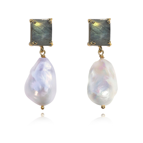 | Made from: | Sterling Silver Earrings Posts (24K Gold Plated)24K Gold PlatingEnvironmentally Friendly BrassPremium Natural Baroque PearlsNatural Labradorite Crystal |