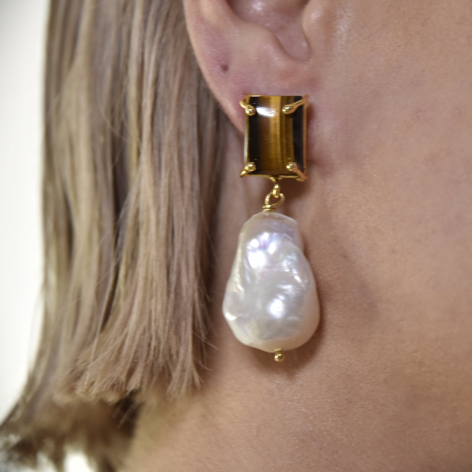 | Made from: | Sterling Silver Earrings Posts (24K Gold Plated)24K Gold PlatingEnvironmentally Friendly BrassPremium Natural Baroque PearlsNatural Tiger Eye Gemstone |