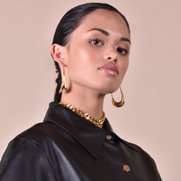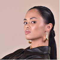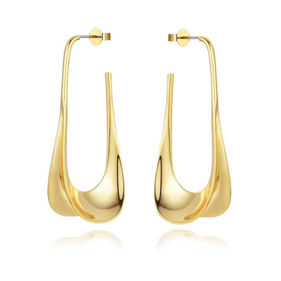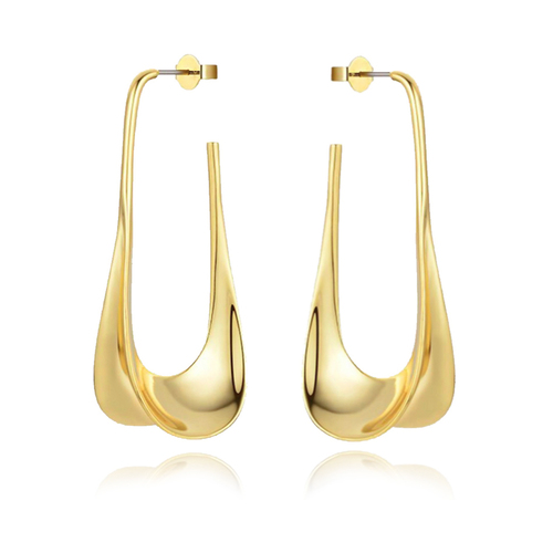 Modern, sleek, and outspoken. Introducing Carmela Catwalk Gold Loop Earrings - a contemporary runway style gold statement for modern muses with a high fashion attitude. This design is inspired by modern shapes expressed in art and interior designs with smooth and succinct outlines. Each earring piece features two 3D gold hoops sitting apart at the bottom and merging together towards the top. The earrings are made of environmentally friendly brass (nickel free) with a rich plating of 18k yellow gold (3 layers of electroplating) to ensure a thick gold bond to the metal. The earring surface is highly polished to a mirror-like effect. Perfect for modern, artsy, runway, creative fashion styling, fashion events, dressy events and more. Hypoallergenic, nickel, cadmium and lead free.