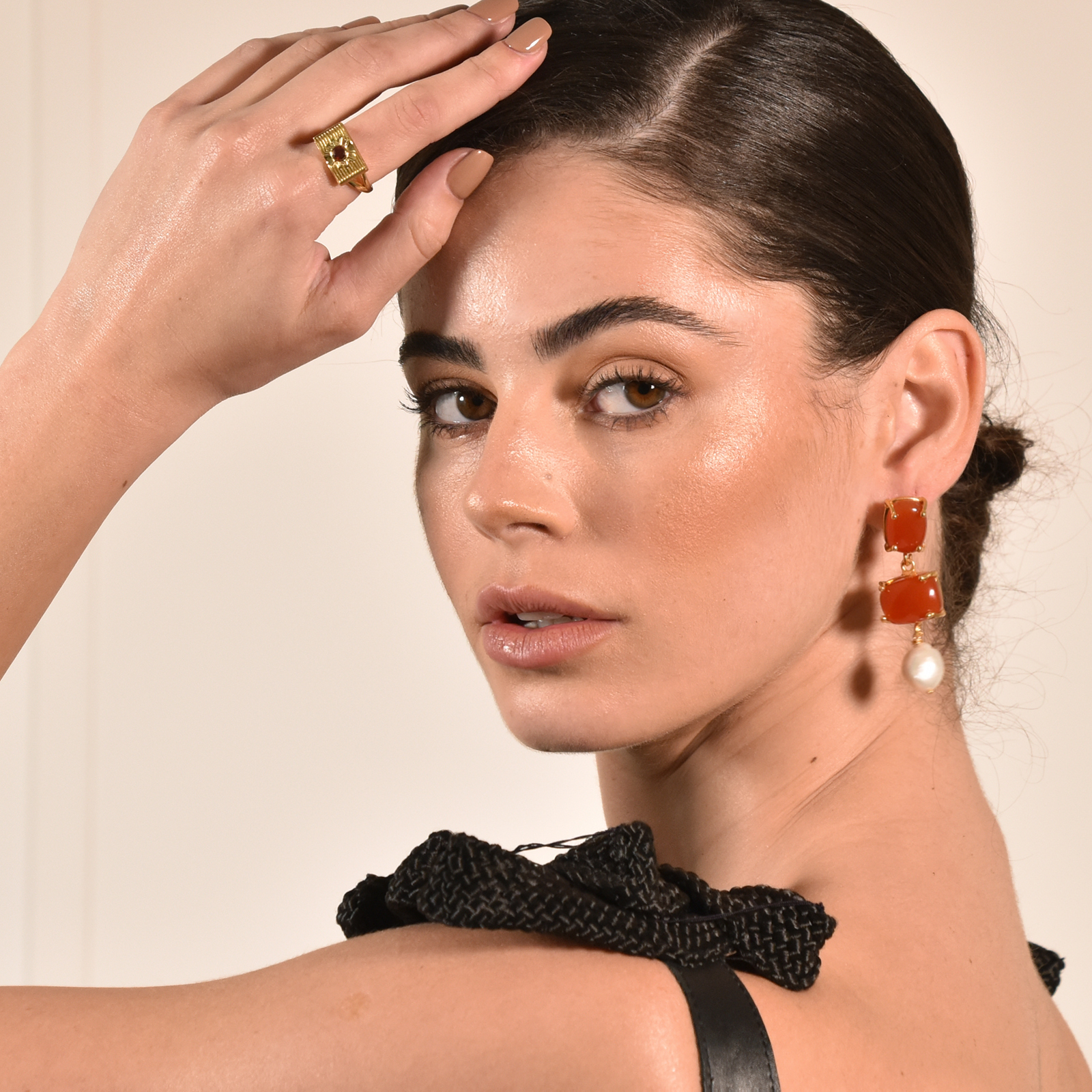 Handcrafted with natural amber-toned carnelian quartz and natural baroque pearls. Introducing Carmine Carnelian Quartz Pearl Drop Earrings - a bright and unique pearl drop statement for pearl and natural gemstone lovers. This design features natural amber-toned carnelian quartz cut in a cabochon shape. From top to bottom of each earring is a vertically laid carnelian, then a horizontally laid carnelian, and a finally natural round shaped baroque pearl. Considering the weight of the stones, a smaller size baroque pearl is chosen. You may notice a subtle red hue change of the carnelian quartz from deep to bright in different lighting. The metal for the body of the earrings is made of environmentally friendly brass with pure 24k gold plating. The earring posts and backings are made of solid sterling silver with 24k pure gold plating, making it 100% skin safe to wear and durable for lifelong wear. Perfect for formal, semi-formal, dressy, bridal, racing, costal, smart casual styles and more. Hypoallergenic, nickel, cadmium and lead free.