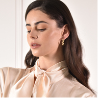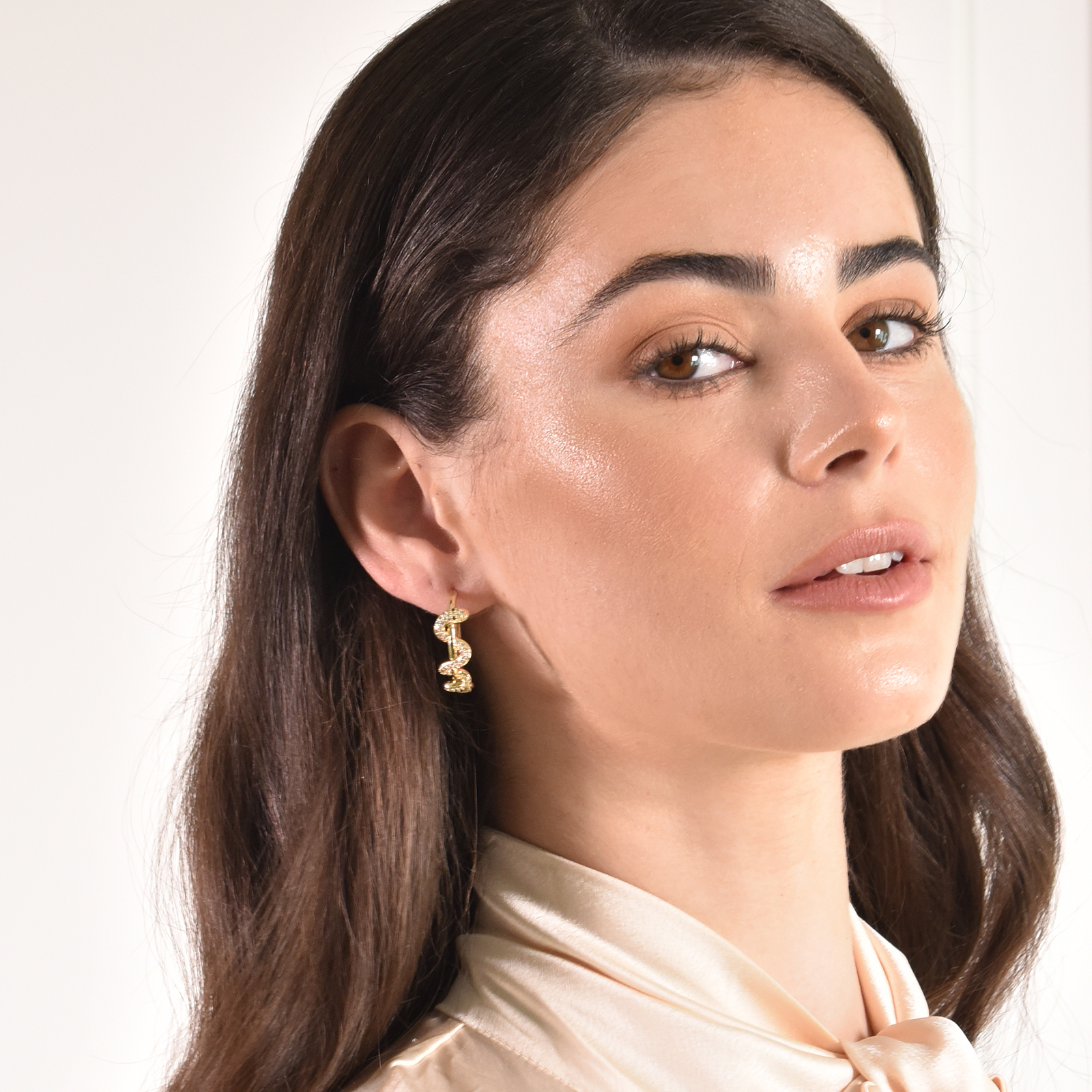 Sassy, attitudy, and stylish. Introducing Celestina Serpent Hoop Earrings - an ear love with a mysterious element. This design features classic gold C hoop earrings with a winding snake on each hoop. Each snake is embellished with cubic zircornias and detail rich. The earrings are made of environmentally friendly brass with quality 18k gold plating and smooth polishing. Perfect for modern, artsy, chic, punk, edgy, creative styling, smart casual, casual styles and more. Hypoallergenic, nickel, cadmium and lead free.