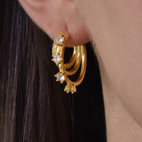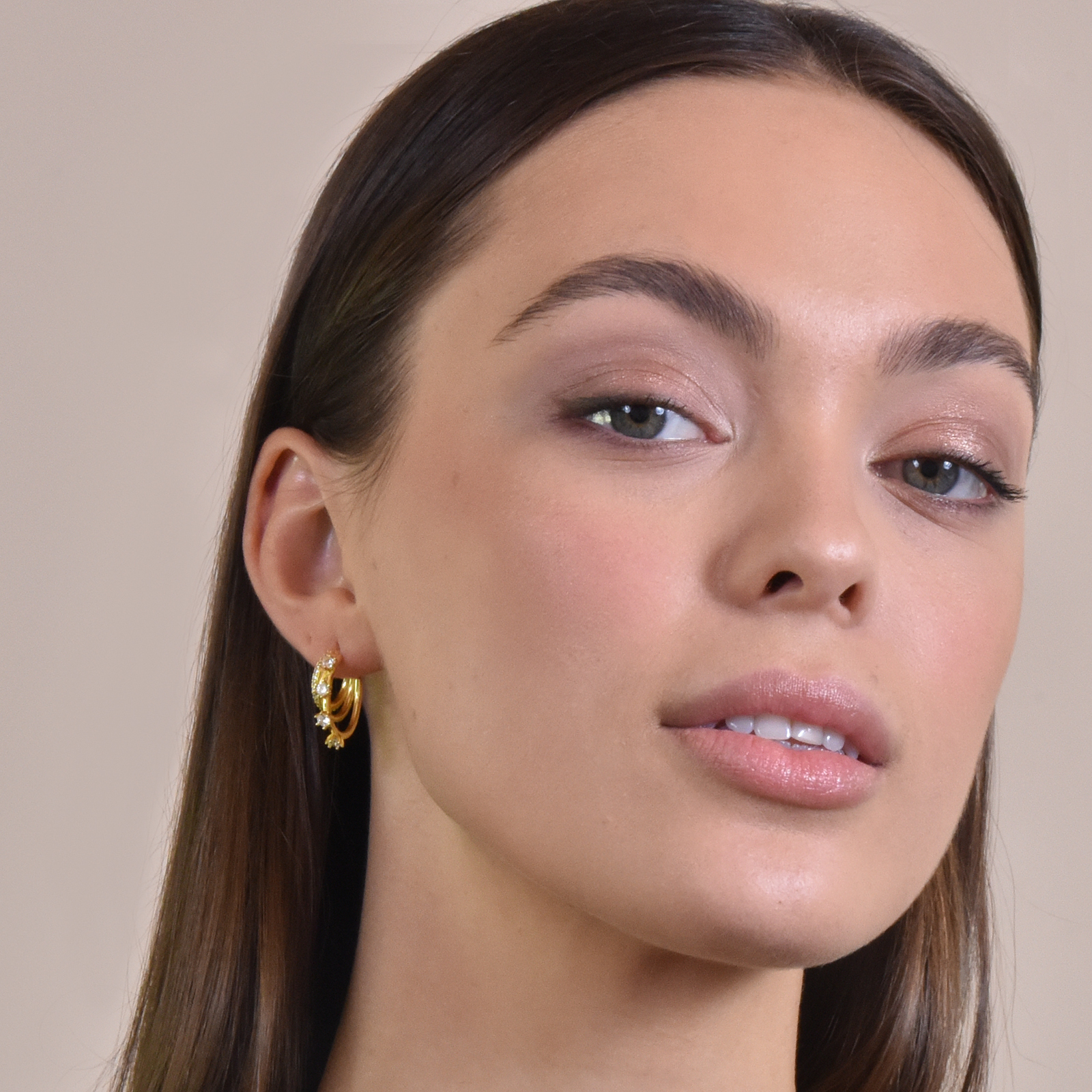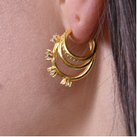 Delicacy and sophistication expressed defined details. Introducing Cendrique Gold Vermeil Topaz Loop Earrings — an exquisite dainty earring style for a high fashion touch. This design is crafted in solid sterling silver with 2.5 microns of 18K gold plating (to Gold Vermeil Jewellery Standards). Each piece features a 3 conjoined half hoops, in 3 sizes. The outer hoop is embellished with 4 clear topaz and the inner hoop embellished with pave clear zircon. A zestful piece that embraces fine craftsmanship and a sense of daring. Perfect for modern, chic, artsy, minimalist, punk, casual, earring layering styles and more. Hypoallergenic, nickel, cadmium and lead free.