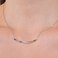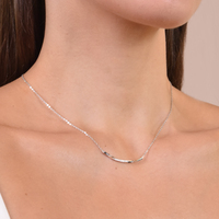Elegant, classy, timelessly fine. Introducing Cesca Fine Silver Bar Pendant Necklace - a modern artisan neckpiece for your elevated everyday styling. This piece features lightly twisted silver bar in a curved shape. The middle front of the silver bar is also embellished with a row of white zircons for a subtle and gorgeous shimmer. Perfect for simple, modern, chic, feminine, artsy, classy, everyday styles and more. Hypoallergenic, nickel, cadmium and lead free.