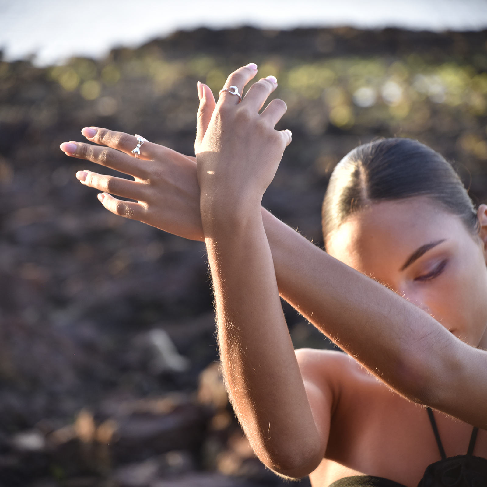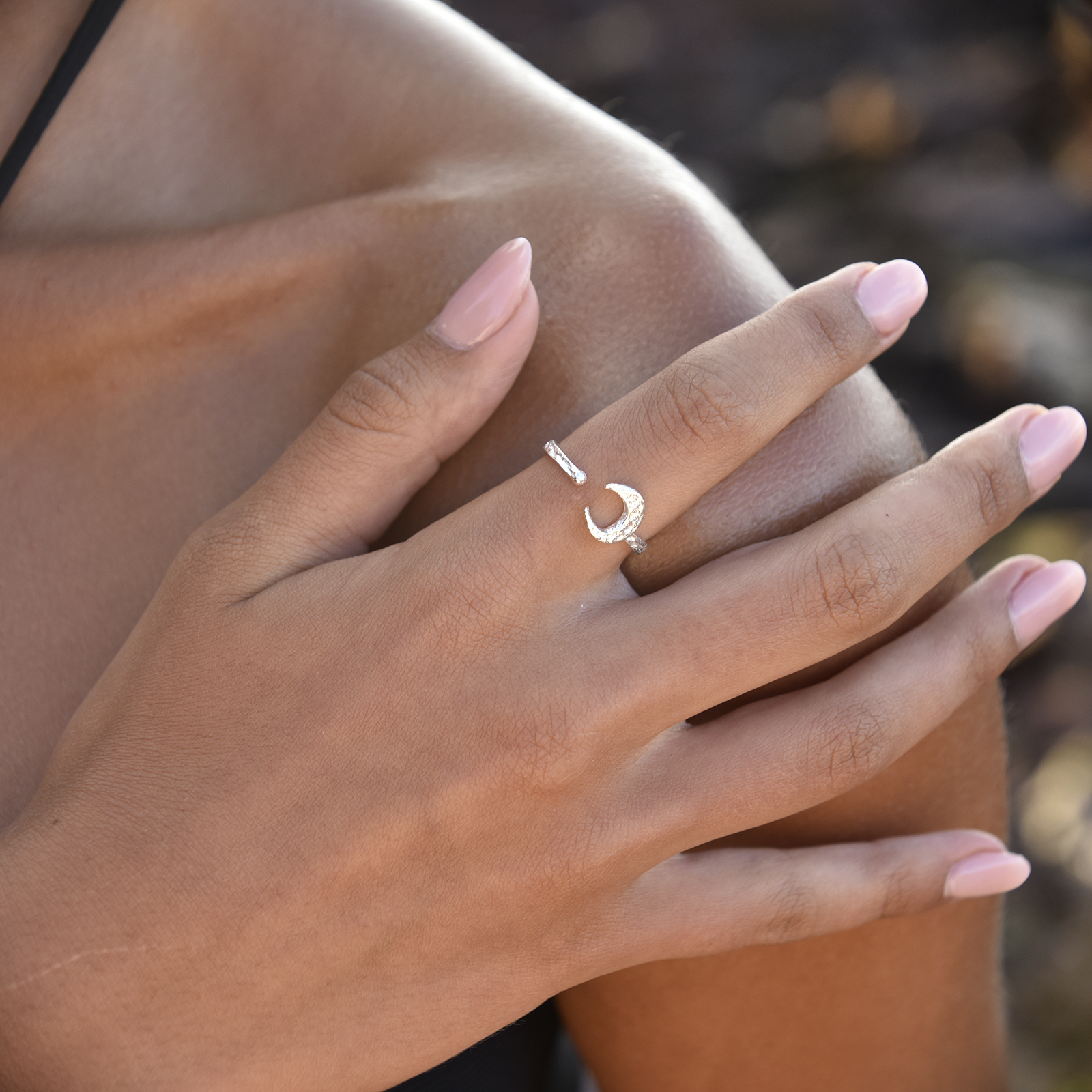 Introducing Chandra Artisan Crescent Moon Open Ring (Silver) - an artisan crafted finger beauty embracing the spiritual and poetic beauty of the moon. This design features a textured open ring band with a crescent moon at one end. This ring is made of solid sterling silver with precious white rhodium plating for a brighter silver shine, hypoallergenic and enduring wear. This ring can be easily adjusted manually for your ideal fit. Perfect for modern, bohemian, coastal, chic, ring layering, smart casual, casual, everyday wear and more. Available in gold or silver. Hypoallergenic, nickel, lead, and cadmium free.