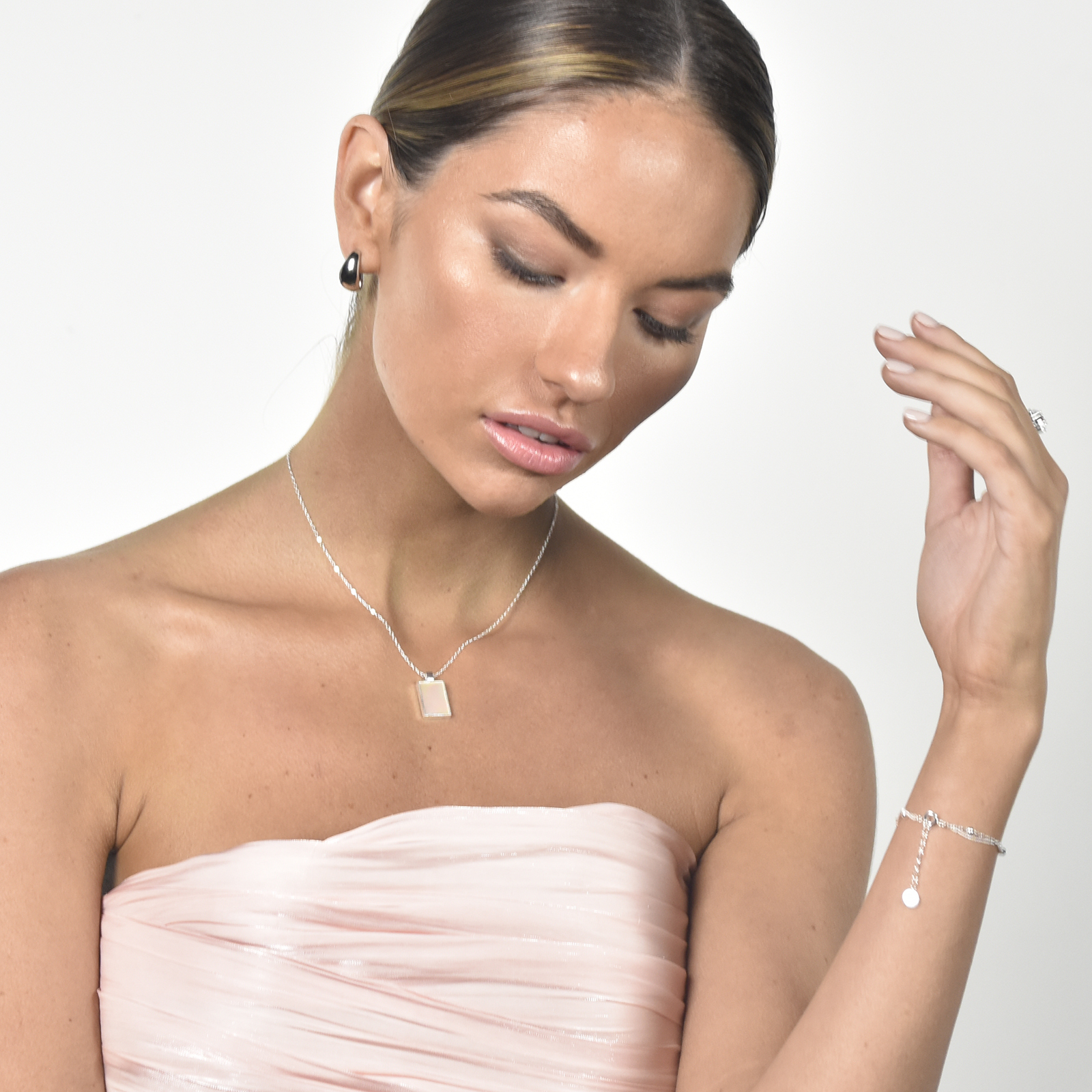 Elegant, subtle, and timeless. Introducing Chantal Mother of Pearl Pendant Necklace (Silver) - a classic and chic neckpiece that is always appropriate. This design features custom cut and polished natural mother of pearl embedded in a rectangular solid sterling silver frame. This neckpiece is made in solid sterling silver with precious white rhodium plating for hypoallergenic, a brighter silver shine and an extra anti-tarnish protection. A classy piece that is not subject to trends. Perfect for modern, retro, feminine, chic, girly, coastal, necklace layering, minimalist, smart casual, casual and everyday style. Hypoallergenic, nickel, lead, and cadmium free.