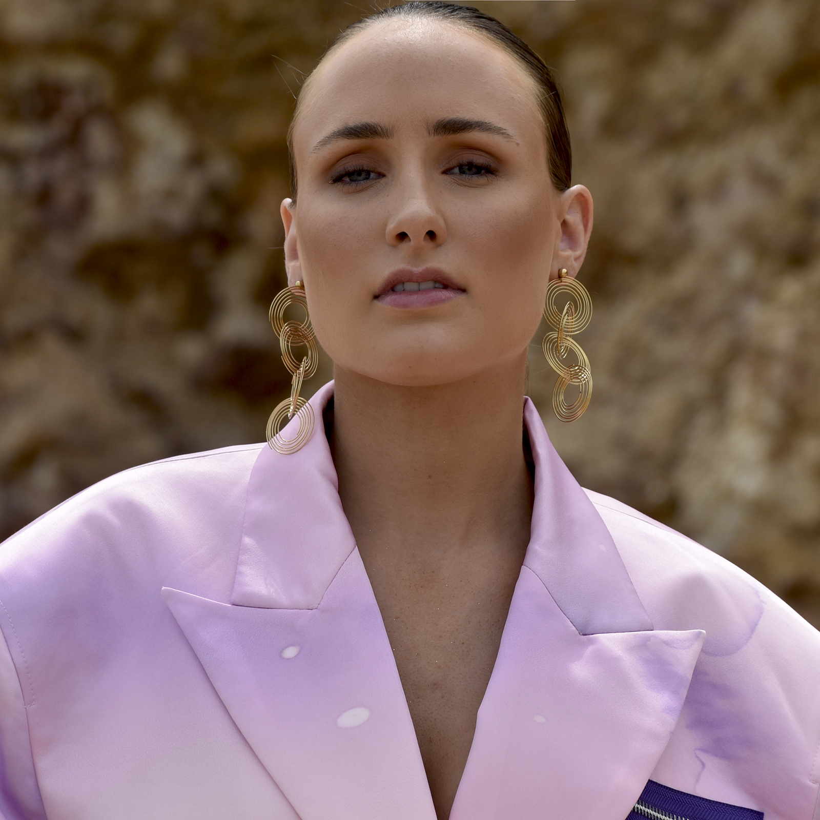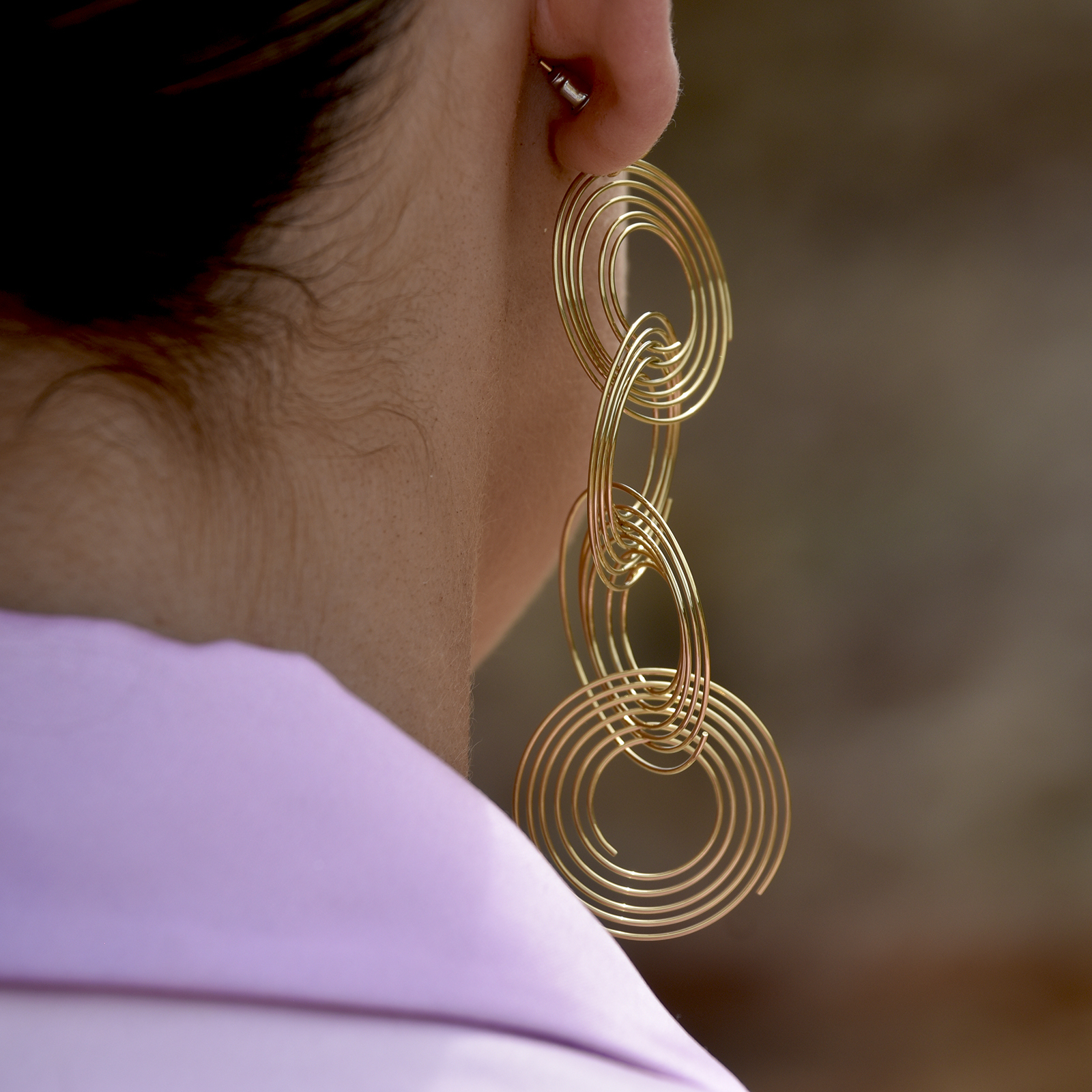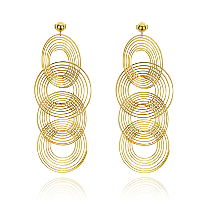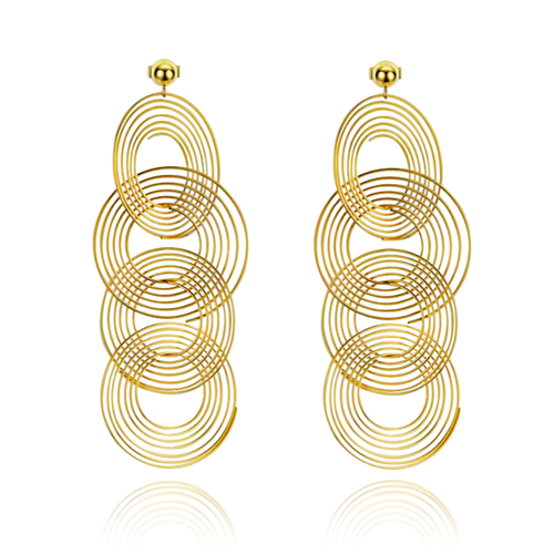 Simplicity in repetition creates sophistication. Introducing Charlie Catwalk Sculpture Loop Earrings - a contemporary artsy ear love inspired by modern moving sculpture. This design features circle loops combined in a creative fashion, allowing movement to be a part of the uniqueness. The earrings are made of environmentally friendly brass with 3 layers of 18k gold plating for an enduring shine. Despite the large size, the earrings are lightweight to wear and easy on the ears. Perfect for statement muses who dare to wear outside the box. Suitable for high fashion, dressy, runway, creative styling, modern, artsy, mismatching, one-earring style, smart causal styles and more. Hypoallergenic, nickel, cadmium and lead free.