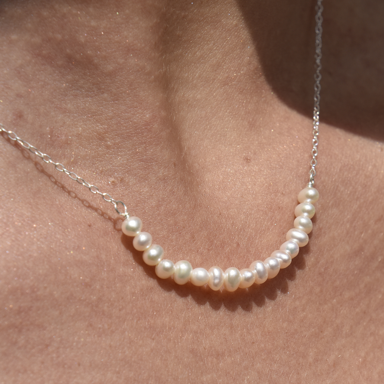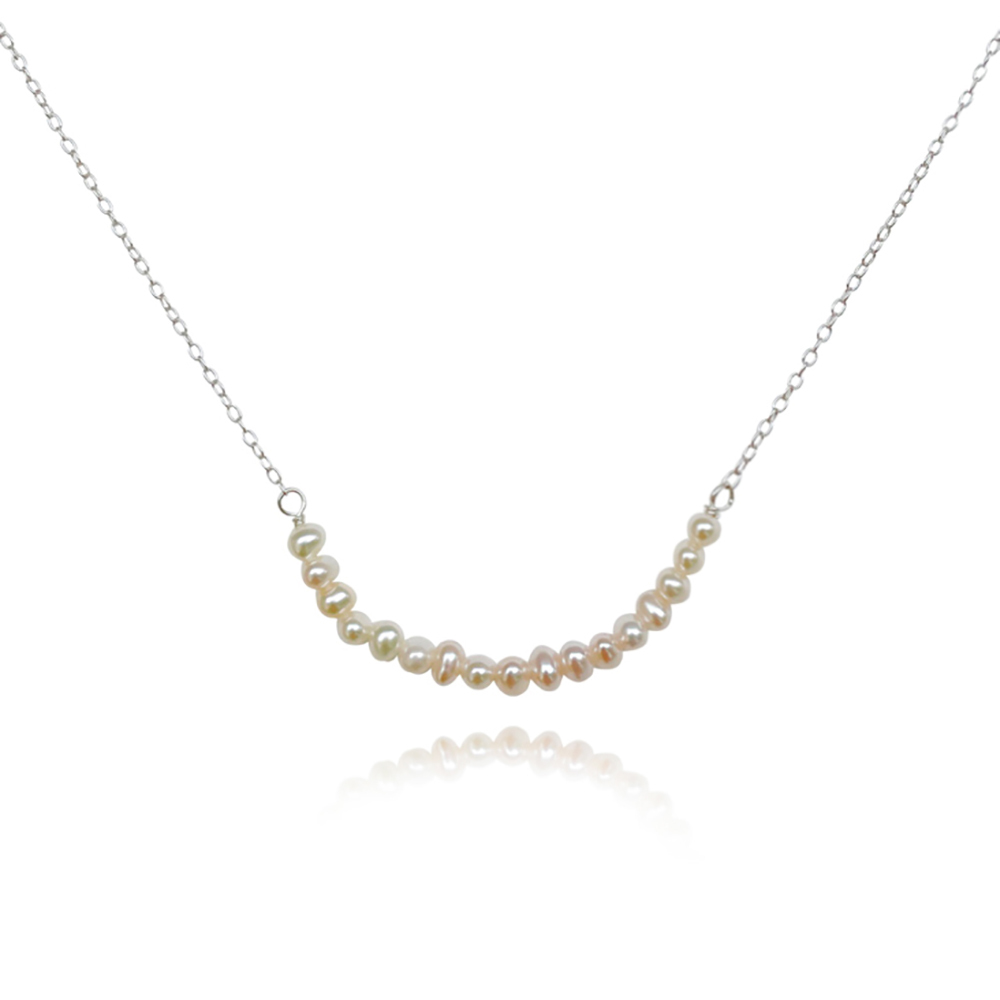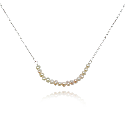 Chic, elegant and always appropriate. Introducing Charlize Freshwater Pearl Pendant Necklace - an artisan handcrafted natural pearl beauty that speaks of beauty combined with softness and strength. This design features handpicked premium quality natural rice-shaped freshwater pearls with a consistent shape, smooth surface and a gorgeous high lustre. The pendant is made of 17 natural freshwater pearls nestled side by side forming an upwards curve. The necklace is made in solid sterling silver with precious white rhodium plating for hypoallergenic, enduring wear, a brighter silver shine and an extra anti-tarnish protection. This necklace is 43.5cm long including a 4.5cm adjustable link (adorned with one freshwater pearl) to create the length you prefer. Perfect for modern, retro, coastal, dressy, chic, feminine, necklace layering, smart casual style, casual, everyday styles and more. Hypoallergenic, nickel, lead, and cadmium free.