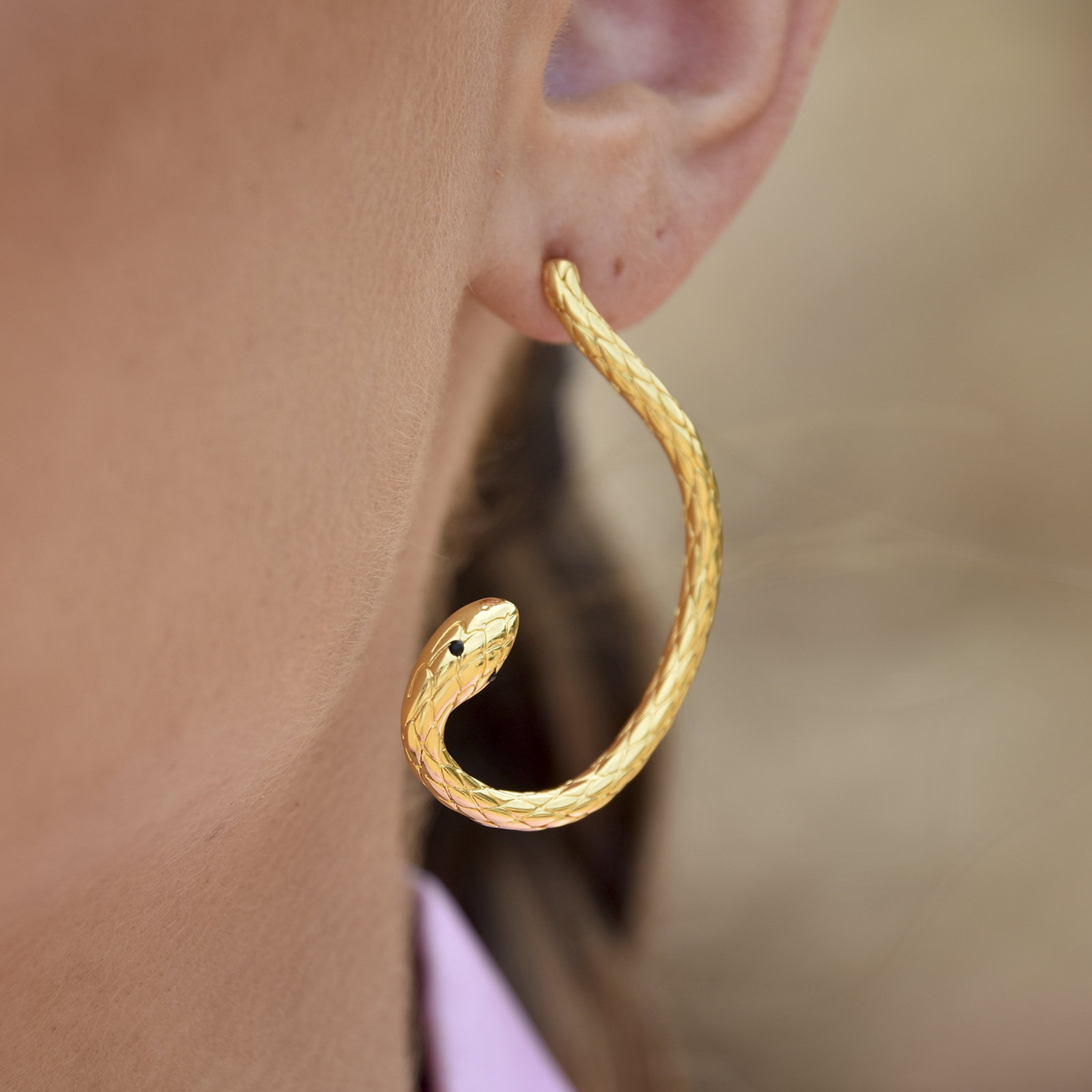 Sophisticated, unique and outspoken. Introducing Charmante Artsy Winding Serpent Earrings - a contemporary creative ear statement for those who seek something extraordinary and dare to wear beyond the norm. This design features large winding snake drops with the tail tips as the earring backings. There are two ways to wear this earring: tail tip in front of the earlobe or tail tip behind the earlobe (please see image gallery). The earrings are made of environmentally friendly brass (nickel free) with high quality 18k gold plating (3 layers) to premium jewellery standard, giving the pieces a luxurious gold shine that endures. Perfect for artsy, creative, high fashion, runway, creative styling, fashion events, smart casual styles and more. Hypoallergenic, nickel, cadmium and lead free.