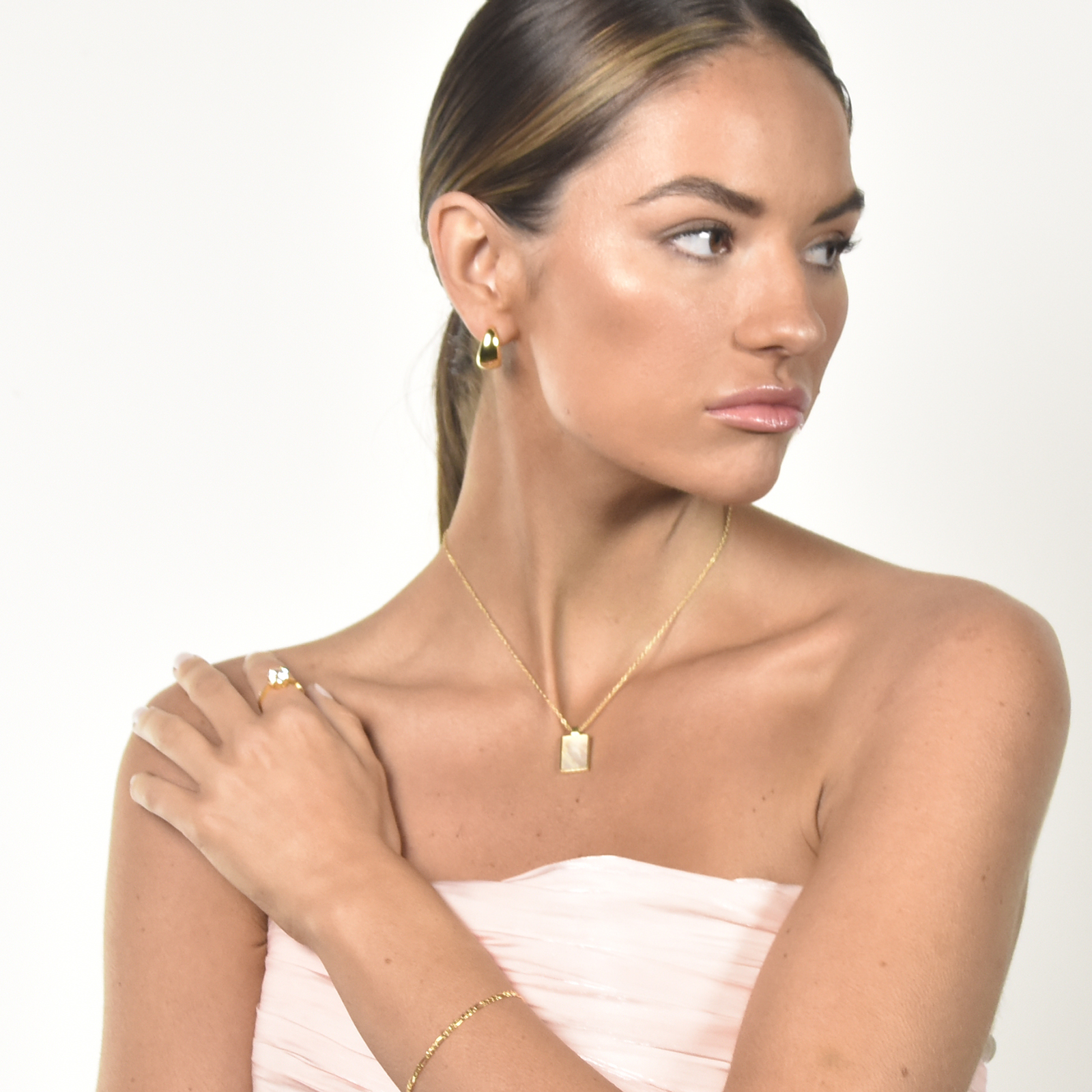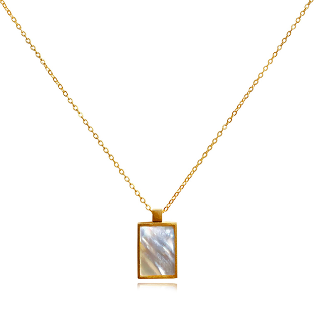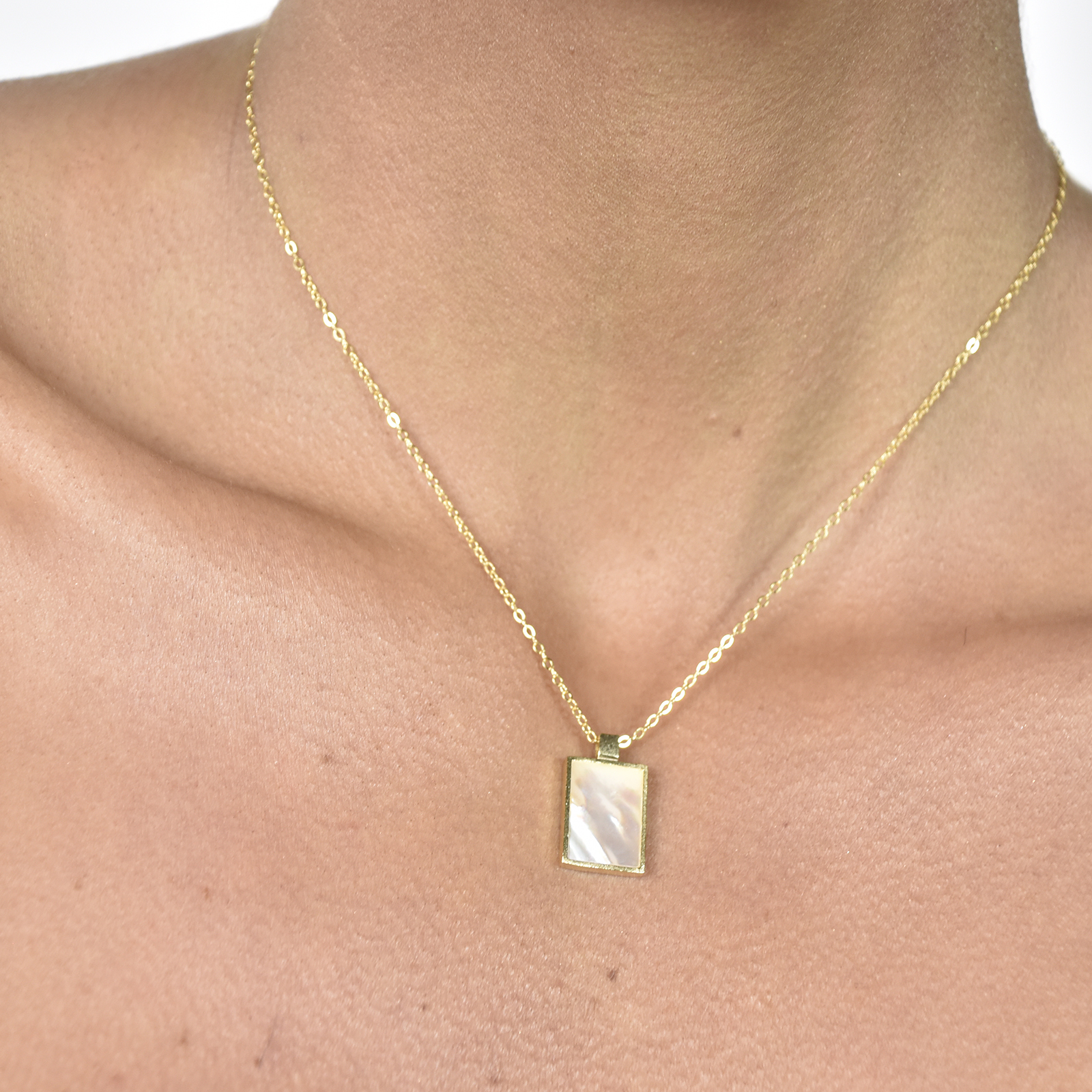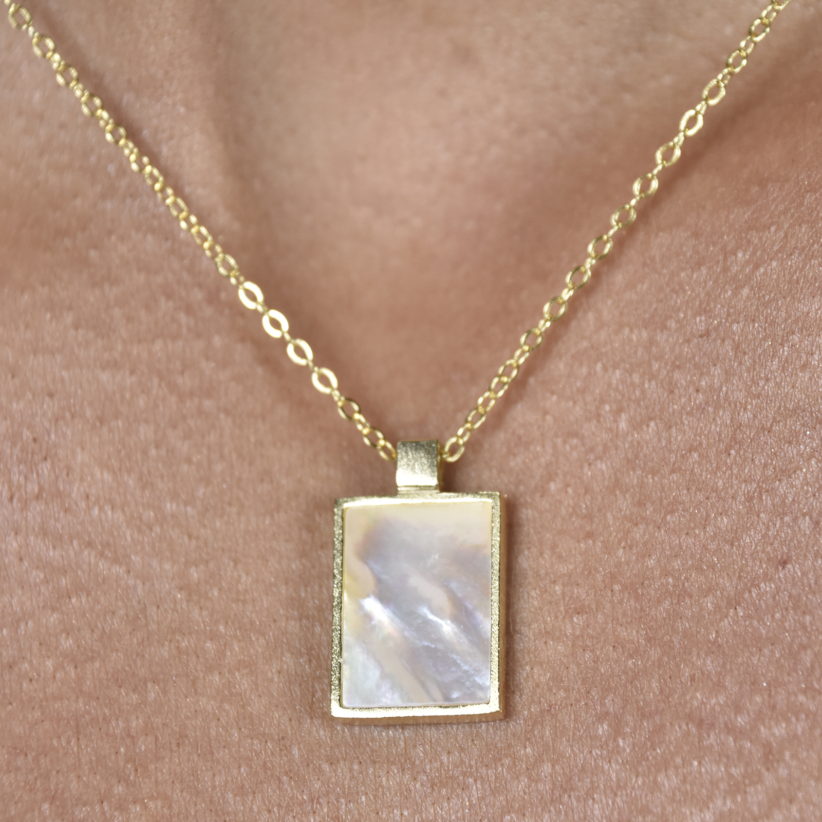 Elegant, subtle, and timeless. Introducing Chantal Mother of Pearl Pendant Necklace (Gold Vermeil) - a classic and chic neckpiece that is always appropriate. This design features custom cut and polished natural mother of pearl embedded in a rectangular gold plated solid sterling silver frame. This neckpiece is made in solid sterling silver with 2.5 microns of 18K gold plating for hypoallergenic and enduring wear. A classy piece that is not subject to trends. Perfect for modern, retro, feminine, chic, girly, coastal, necklace layering, minimalist, smart casual, casual and everyday style. Hypoallergenic, nickel, lead, and cadmium free.