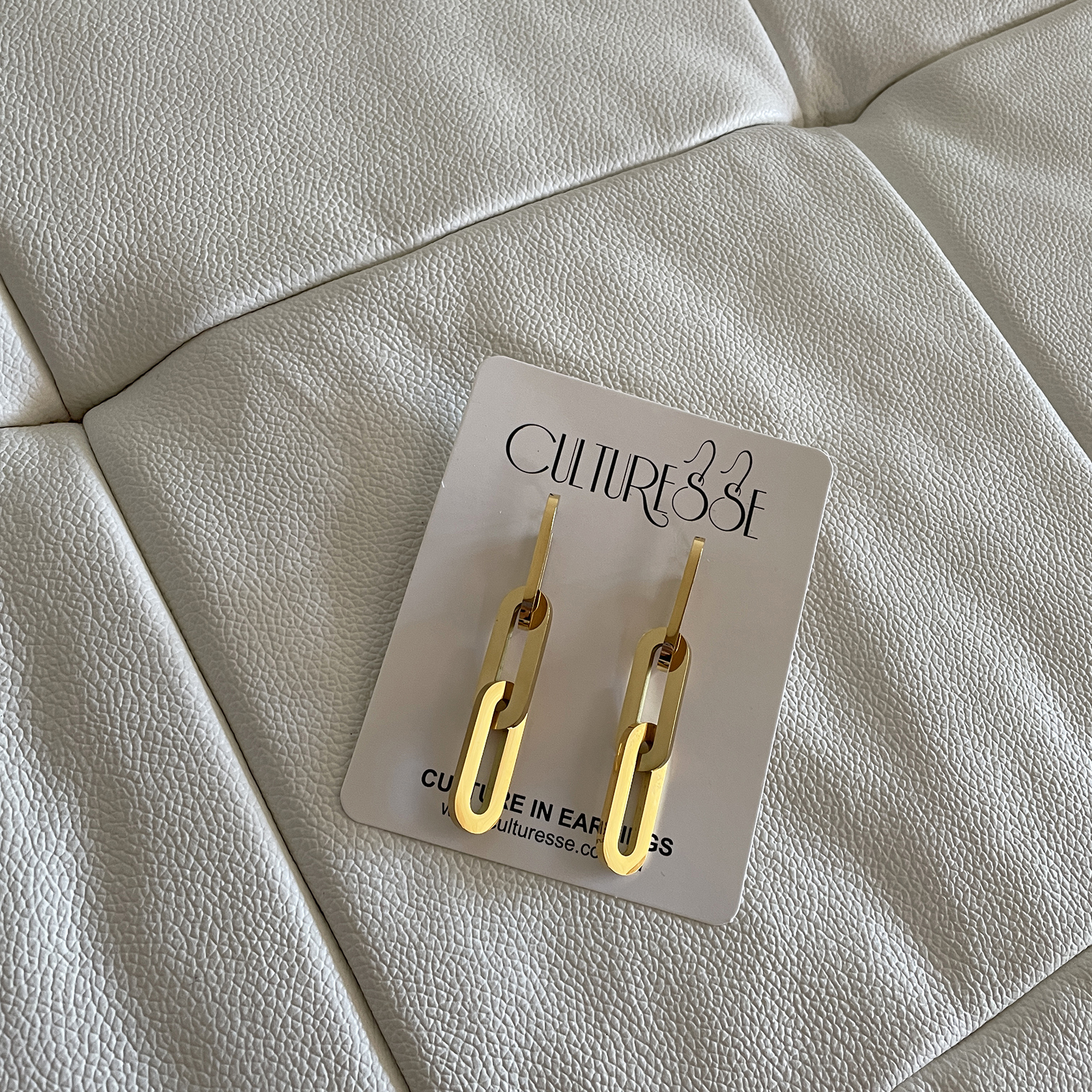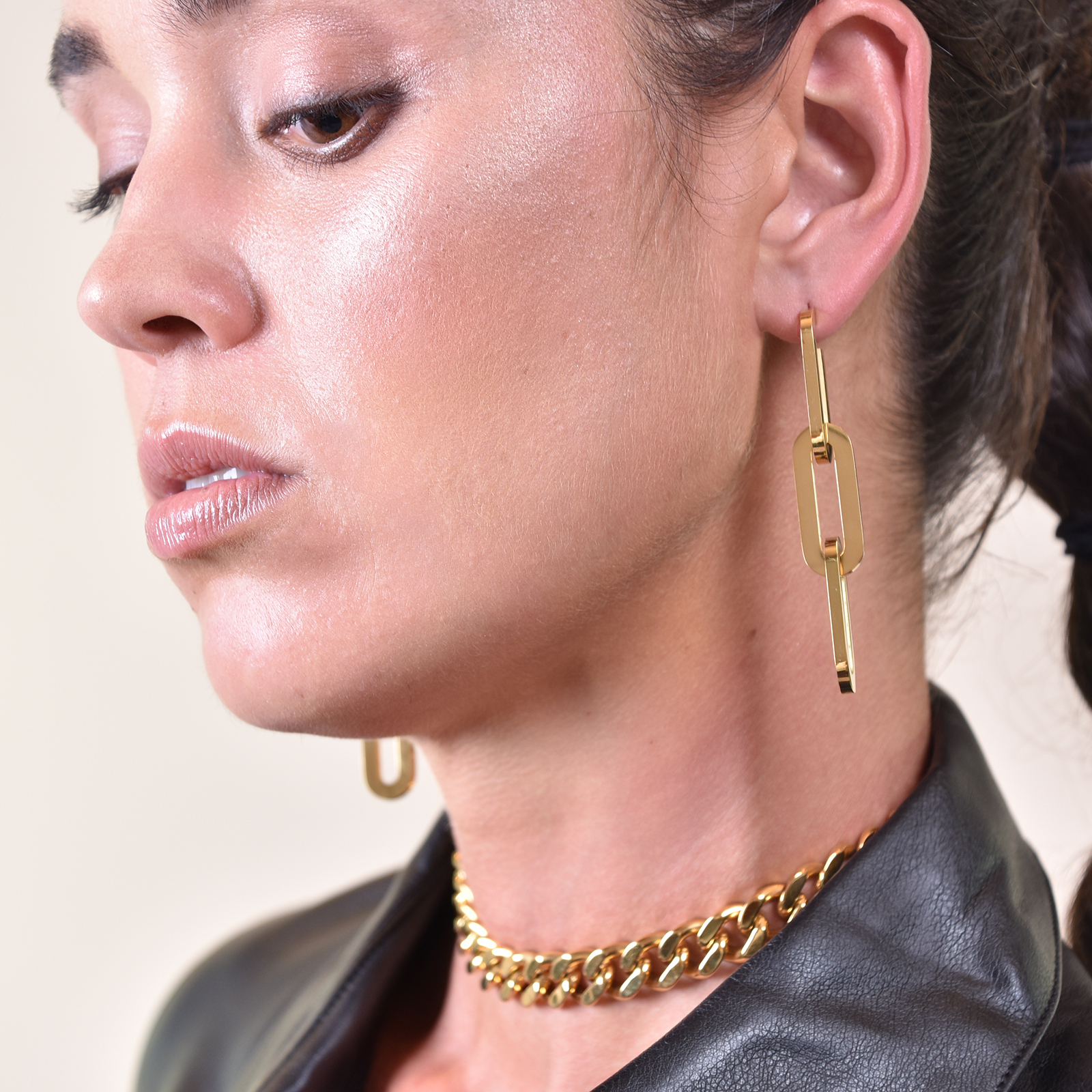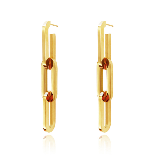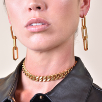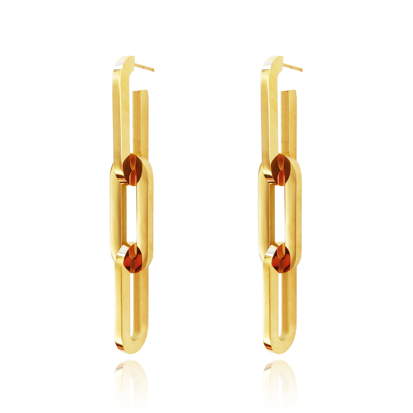 Perfect smooth polish with strength and edginess. Introducing Chevelle 18K Modern Chain Drop Earrings — a contemporary link chain ear statement for the modern woman. This design features 3 oval-shaped chain links made of surgical-grade stainless steel, with 3 layers of 18K electroplating, forming a much thicker gold bond to premium jewellery standards. The metal surface is highly polished to compliment the 18k yellow gold shine. Perfect for modern, retro, chic, punk, high fashion, smart casual styles and more. Hypoallergenic, nickel, cadmium and lead free.