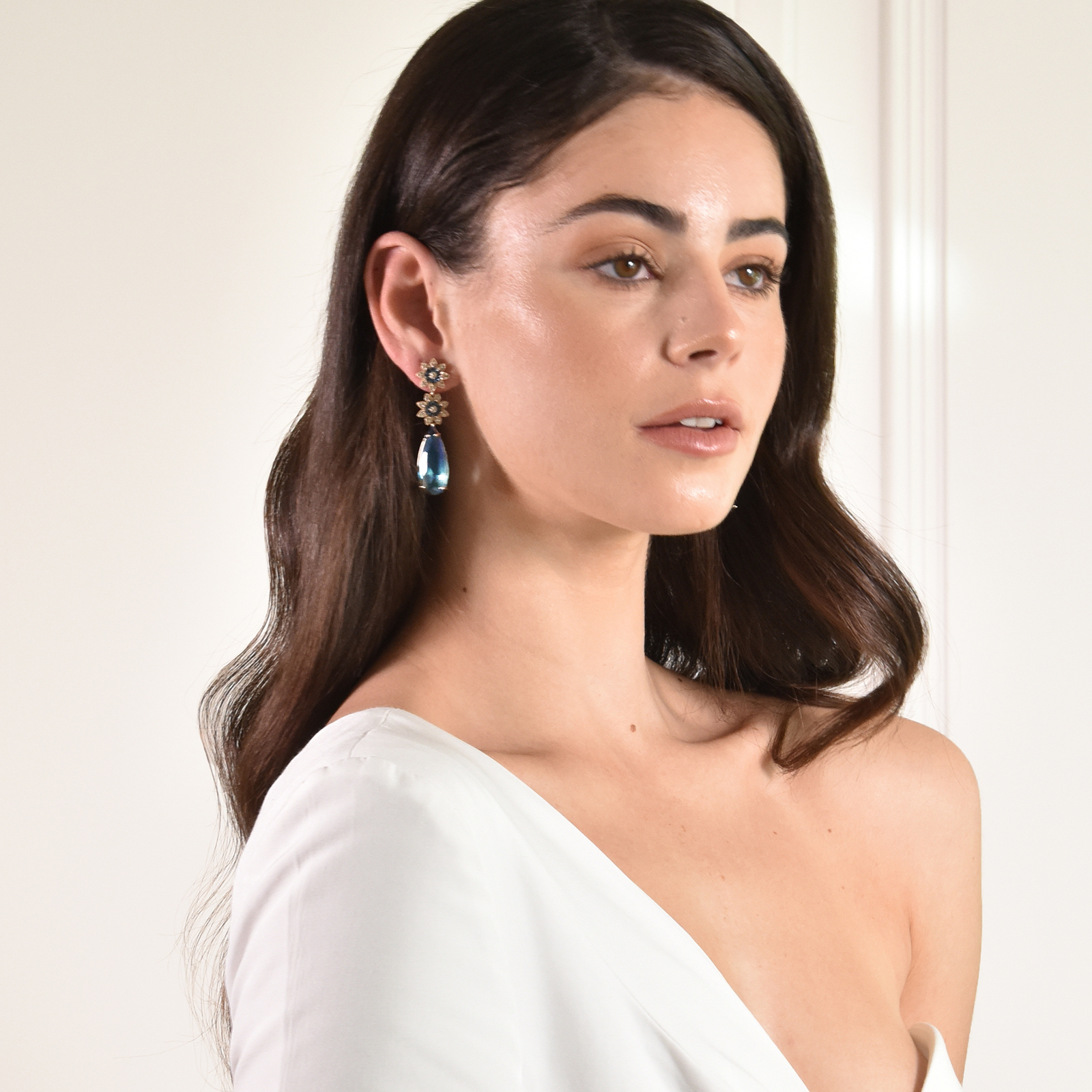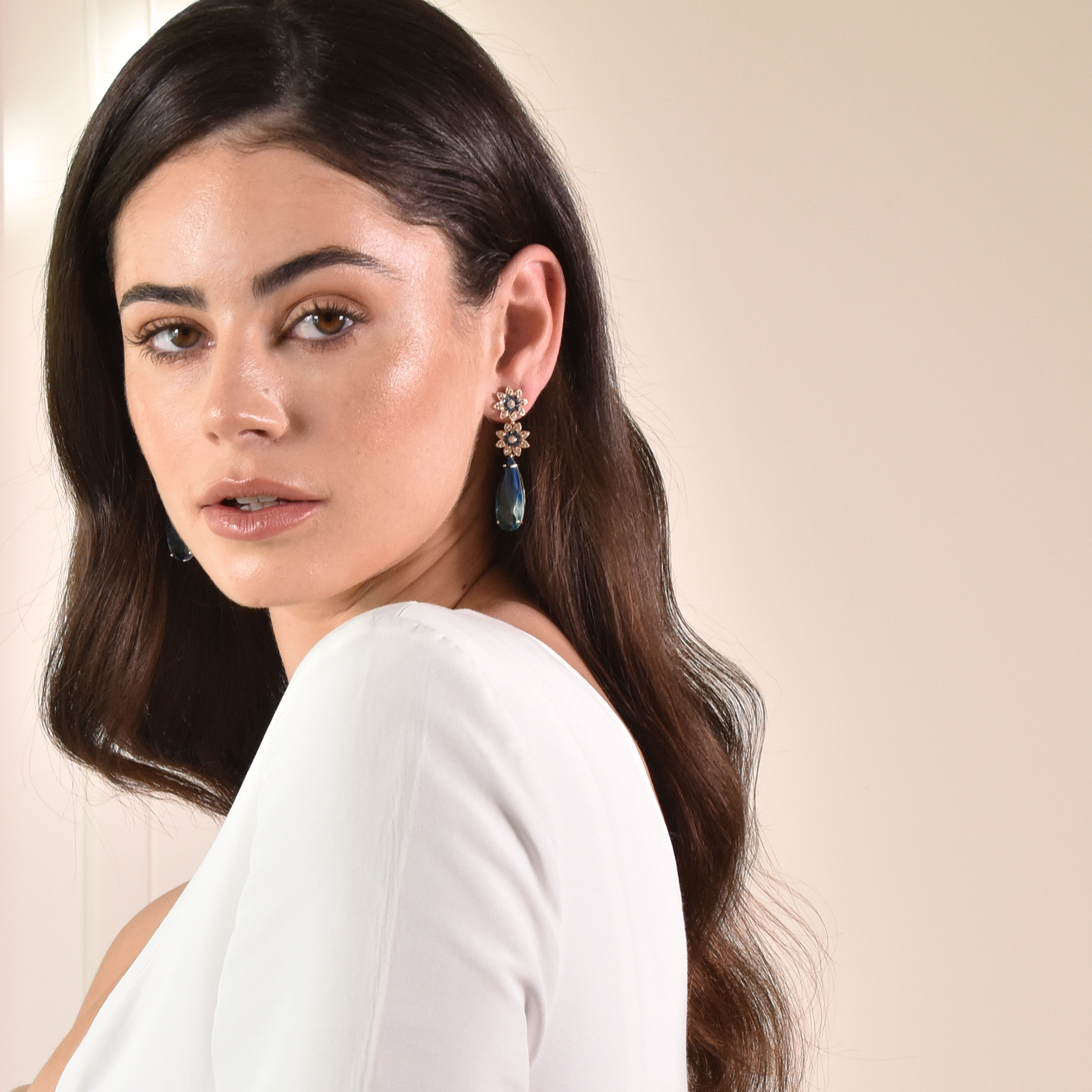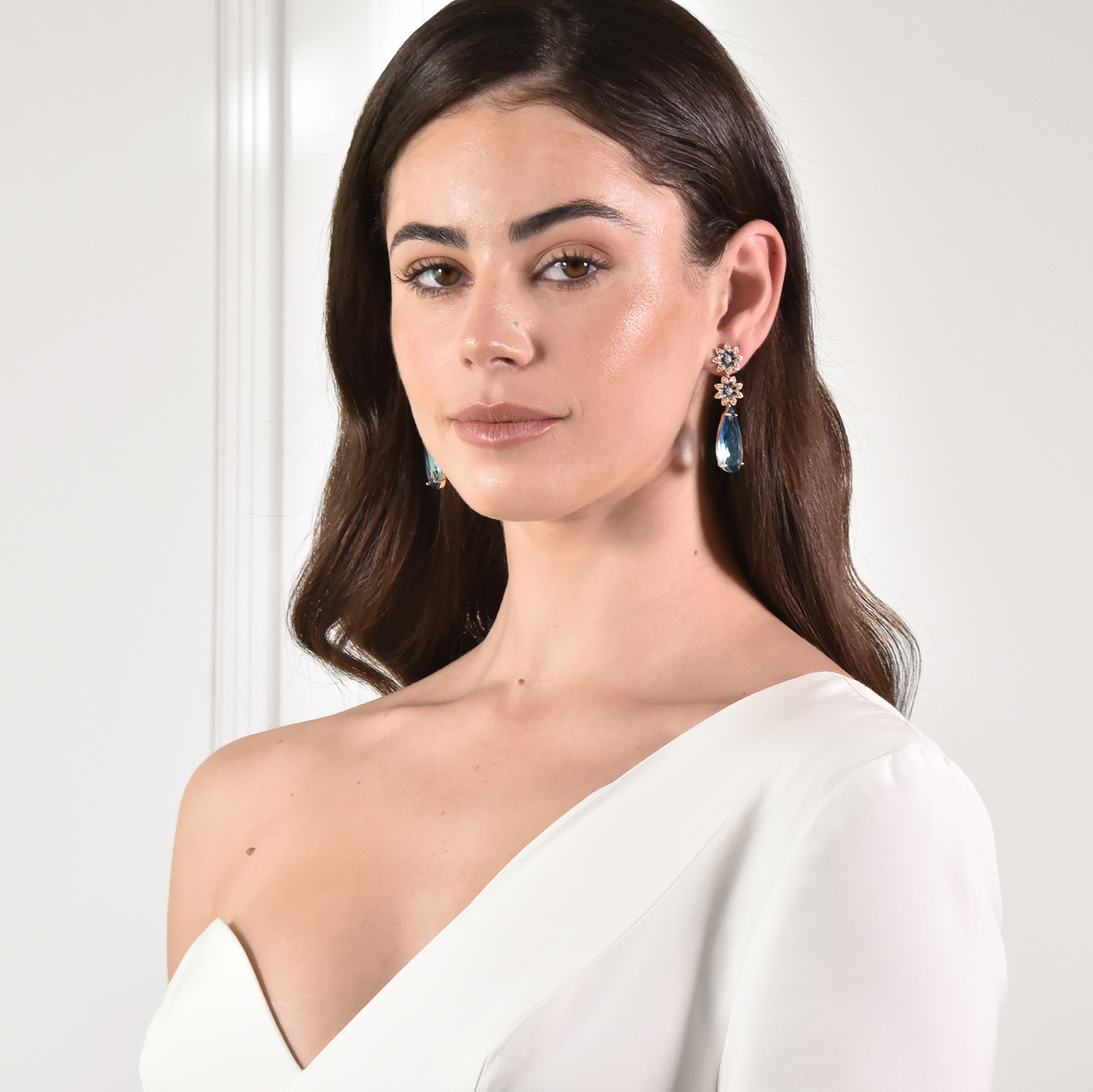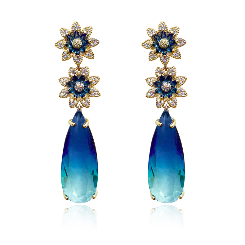 Elegance enriched with luxury details. Introducing Claramay Glamour Zircon Drop Earrings - a dressy earring style for glamorous occasions. This design features large ocean blue Austrian zircons in a prone setting style. Blue zircon is pleochroic, meaning it can appear to be different colours when viewed from various angles.The petal top is finely crafted and embellished with Austrian blue zircons and clear zirconias. The earrings are made of environmentally friendly brass with 14k gold plating, giving the earrings a subtle light gold shine that is gentle and endures. Perfect for formal, semi-formal, dressy, evening, wedding, bridal, award, high fashion, racing, feminine styles and more. Hypoallergenic, nickel, cadmium and lead free.