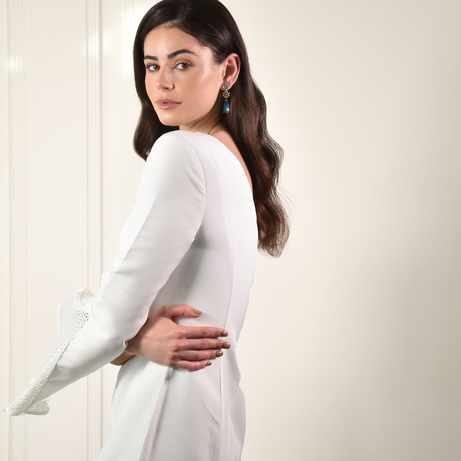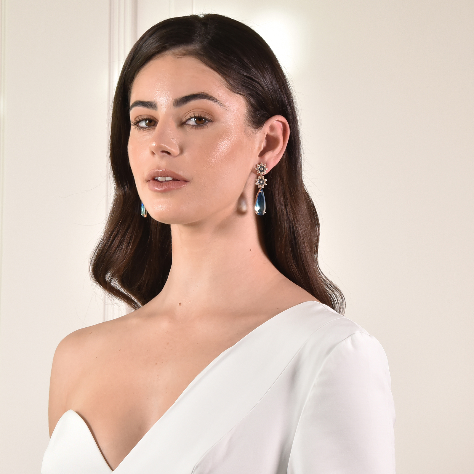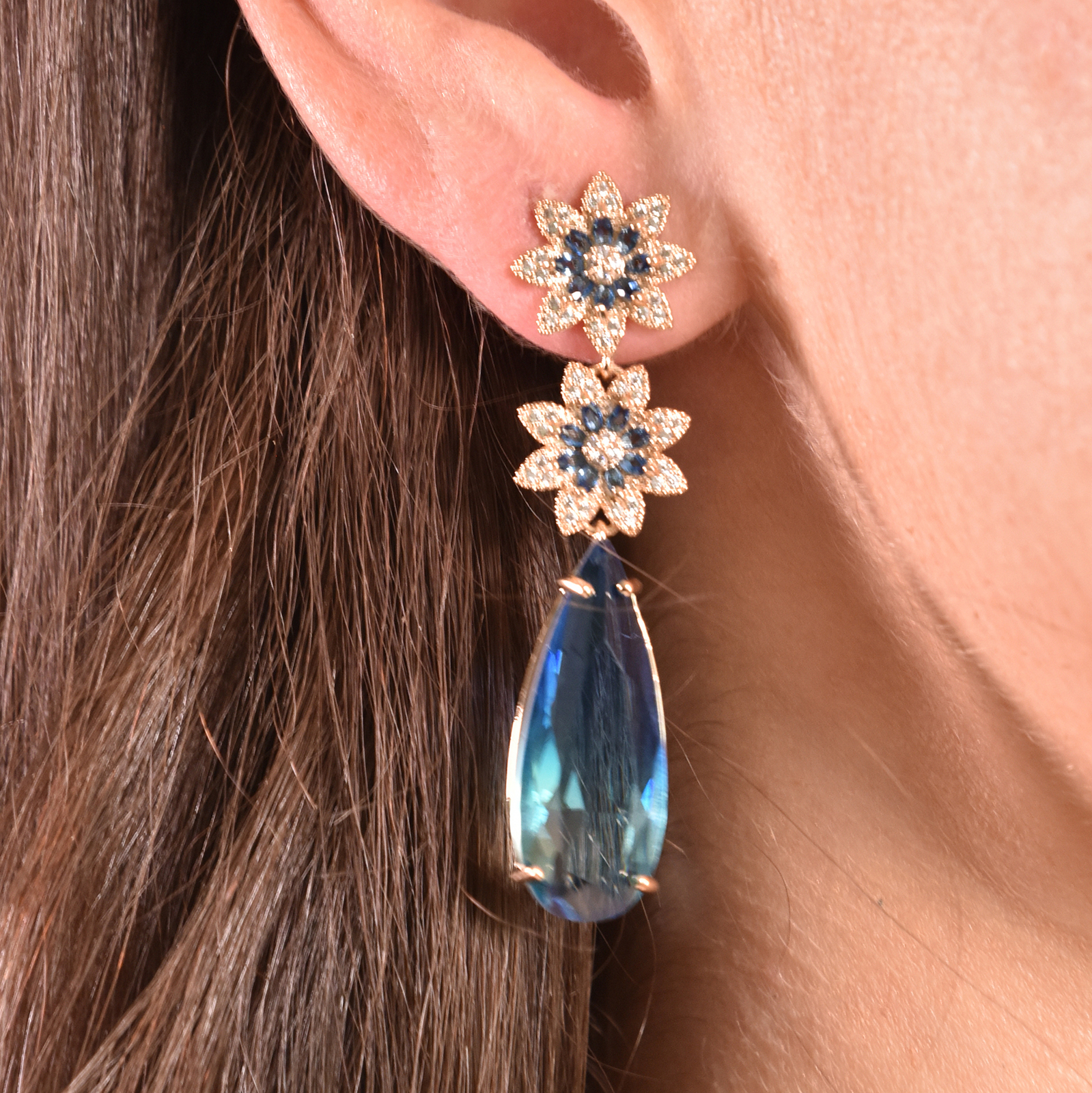 Elegance enriched with luxury details. Introducing Claramay Glamour Zircon Drop Earrings - a dressy earring style for glamorous occasions. This design features large ocean blue Austrian zircons in a prone setting style. Blue zircon is pleochroic, meaning it can appear to be different colours when viewed from various angles.The petal top is finely crafted and embellished with Austrian blue zircons and clear zirconias. The earrings are made of environmentally friendly brass with 14k gold plating, giving the earrings a subtle light gold shine that is gentle and endures. Perfect for formal, semi-formal, dressy, evening, wedding, bridal, award, high fashion, racing, feminine styles and more. Hypoallergenic, nickel, cadmium and lead free.