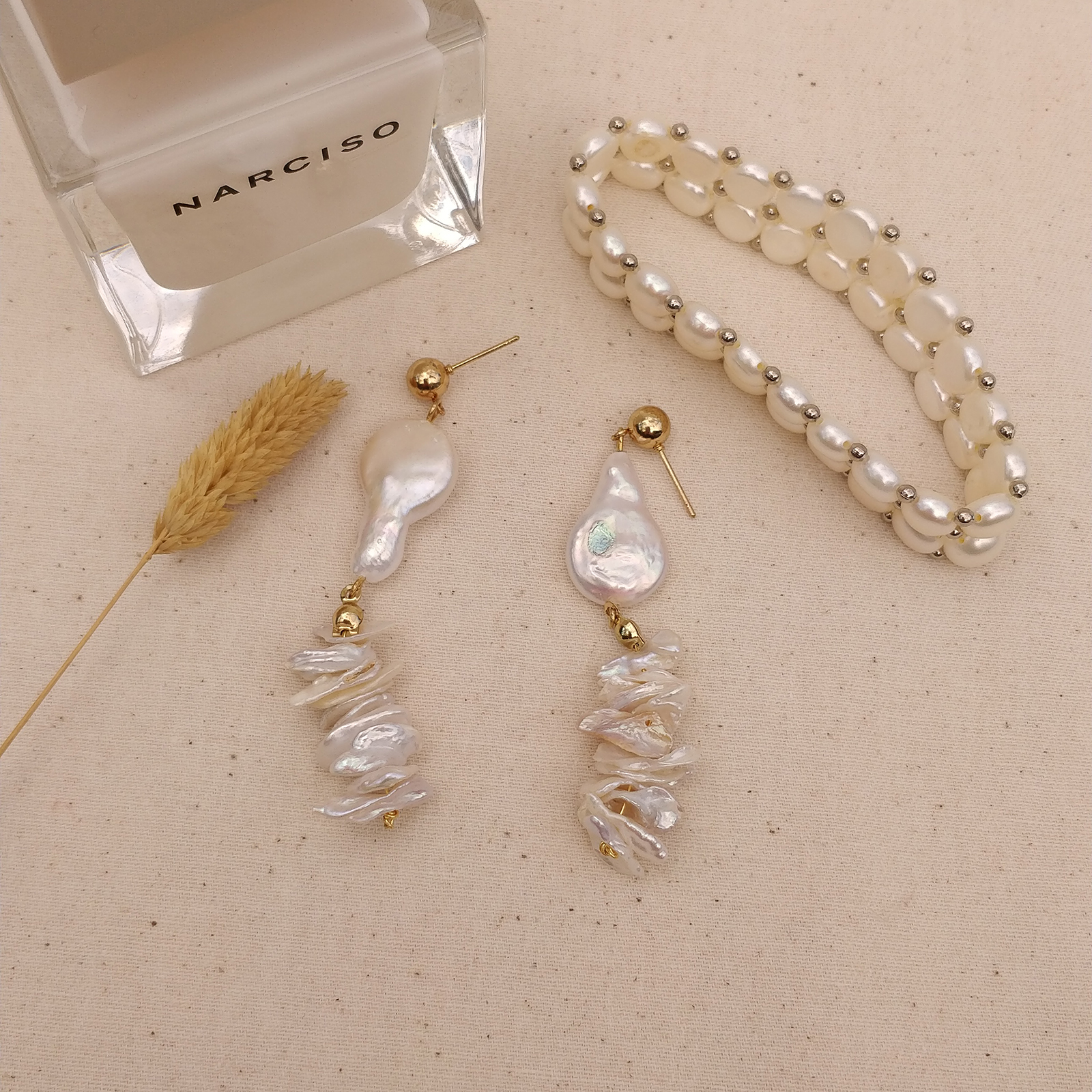 The pearls used in this design are baroque keshi pearls and baroque stick pearls.