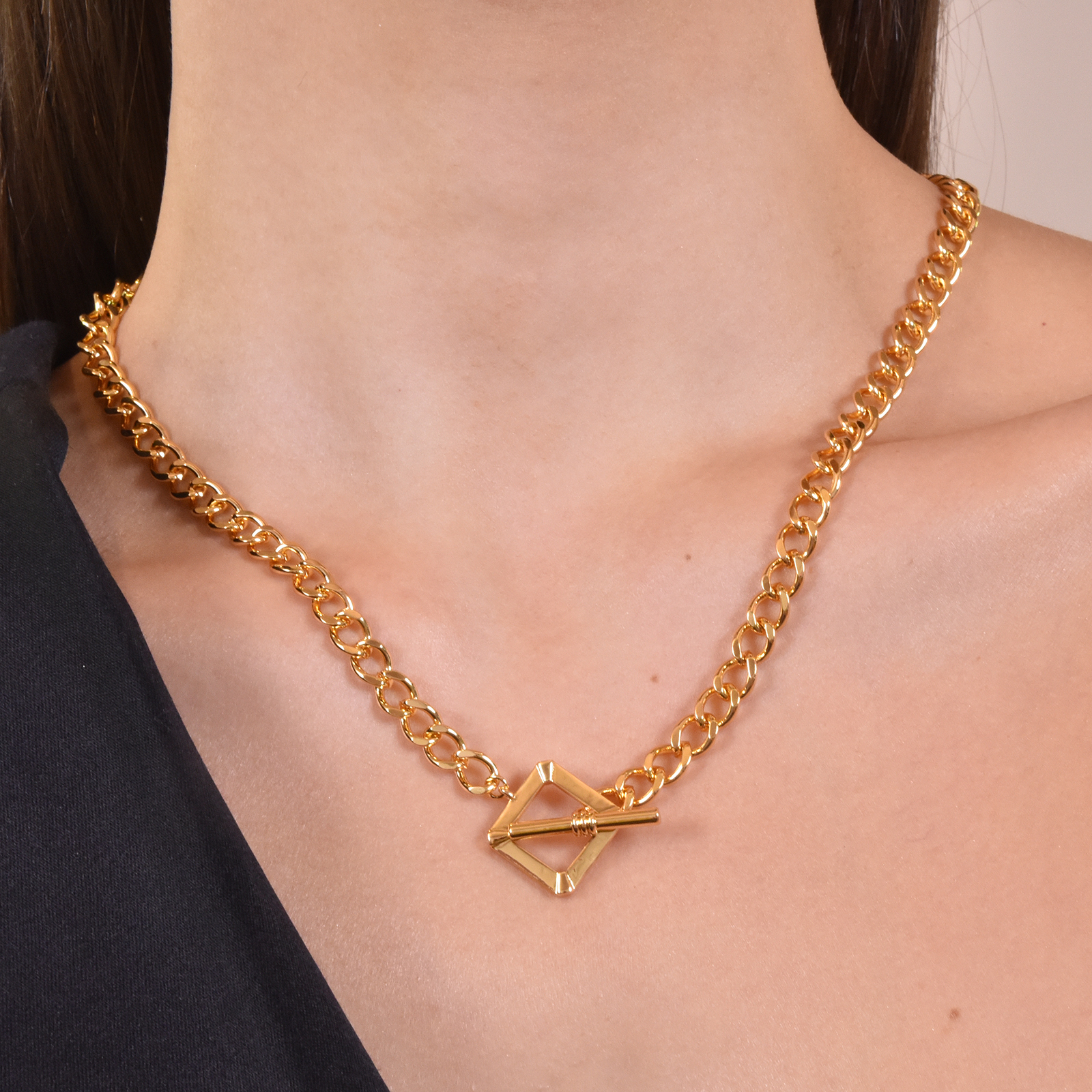 Modern muse style with enduring gold. Introducing Coco 24K Gold Buckle Chain Necklace - a simple yet eye-catching chain style for dress-ups and dress-downs. This design features a frame style buckle and gold bar for a unique closure. The chain is made of environmentally friendly brass (nickel free) with 2.5 microns of pure 24K gold plating , ensuring a much thicker gold bond to the metal and a luxurious 24K gold shine. Perfect for contemporary, artsy, femme, chic, punk, minimalist, smart casual styles and more. Hypoallergenic, nickel, cadmium and lead free.