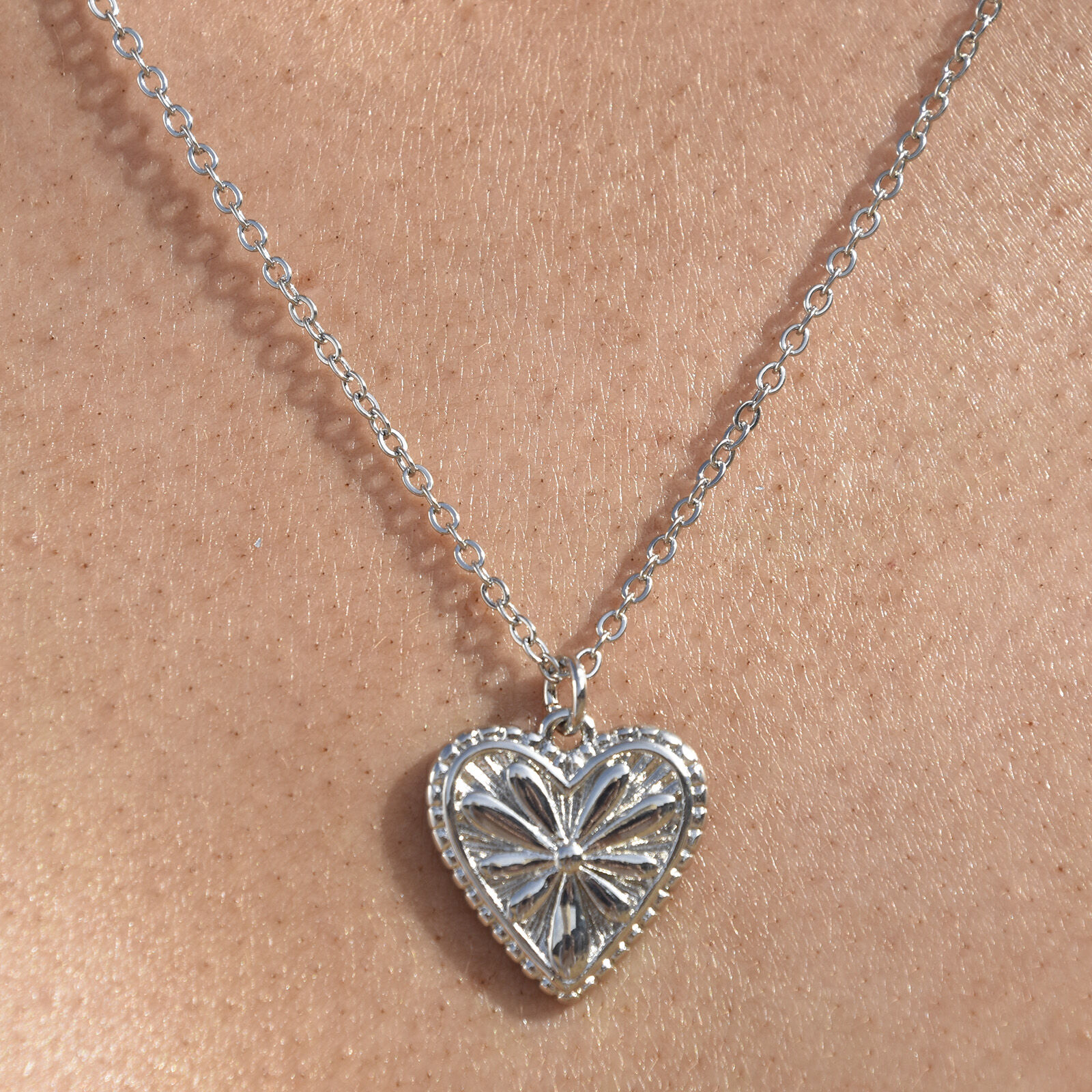 A dreamer and a doer who embraces imprints of life. Introducing Corena Petal Embossed Heart Pendant Necklace (Silver) - an artisan neckpiece that carries the essence of both retro and modern vibes. This design features a heart-shaped pendant with an embossed petal in the middle. This neckpiece is crafted in sterling silver for hypoallergenic wear. The necklace is 50.5cm long including a 5cm adjustable chain for a preferred personal fit. A dreamy and jolie piece for versatile styling and layering. Hypoallergenic, nickel, lead, and cadmium free. Available in 18ct gold or silver.