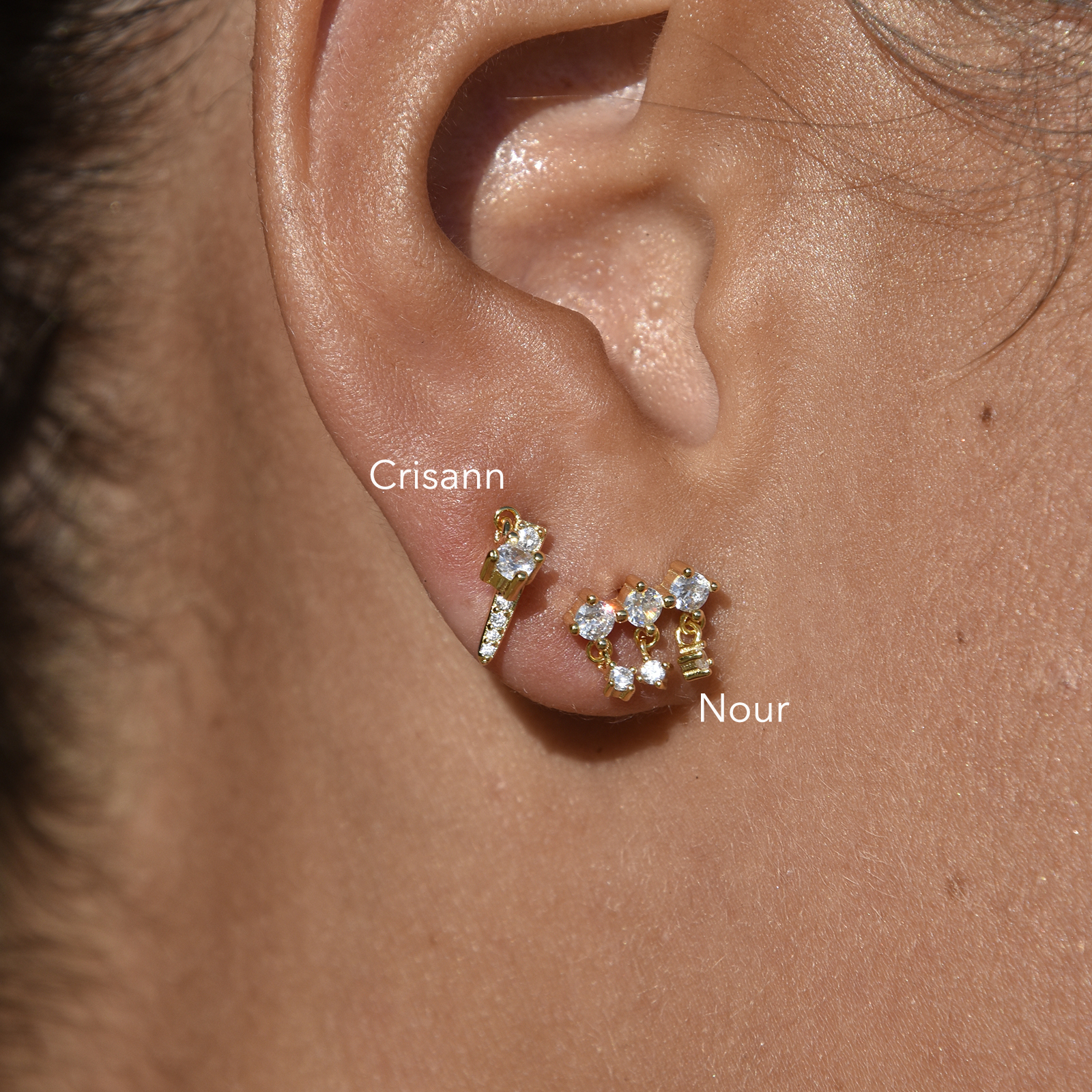 Chic shimmer with a dainty dangle. Introducing Crisann Diamante Spike Stud Earrings (Gold) - a delicate and unique ear stud for a subtle shimmer and dangle. This design features dainty spike studs each embellished with seven Austrian zirconia diamantes. Each spike is also adorned with a larger Austrian zirconia on the side. The earrings are made in solid sterling silver with 18K gold plating for a lasting and noble gold shine. Perfect for girls and women of all ages and for all personal styles. Perfect for earring layering. Hypoallergenic, nickel, lead, and cadmium free.