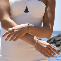 A chic and solid blend of dual chains and natural black onyx stone. Introducing Dakota Black Onyx Dual Chain Bracelet (Gold Vermeil) - an artsy and contemporary style wrist beauty adding a subtle strength to your styling. This design features a half dual link chain and a half cuban chain connected by a natural black onyx stone embedded in a textural claw setting in the middle. This bracelet is made of solid sterling silver with 2.5 microns of 18K gold plating (to Gold Vermeil Jewellery Standard and is 4 times thicker than gold plating used in average fashion jewellery). It is 20cm long including a 3.5cm adjustable link for a more flexible fitting. Perfect for modern muses who prefer something made of congruent quality and outside the norm. Hypoallergenic, nickel, cadmium and lead free.