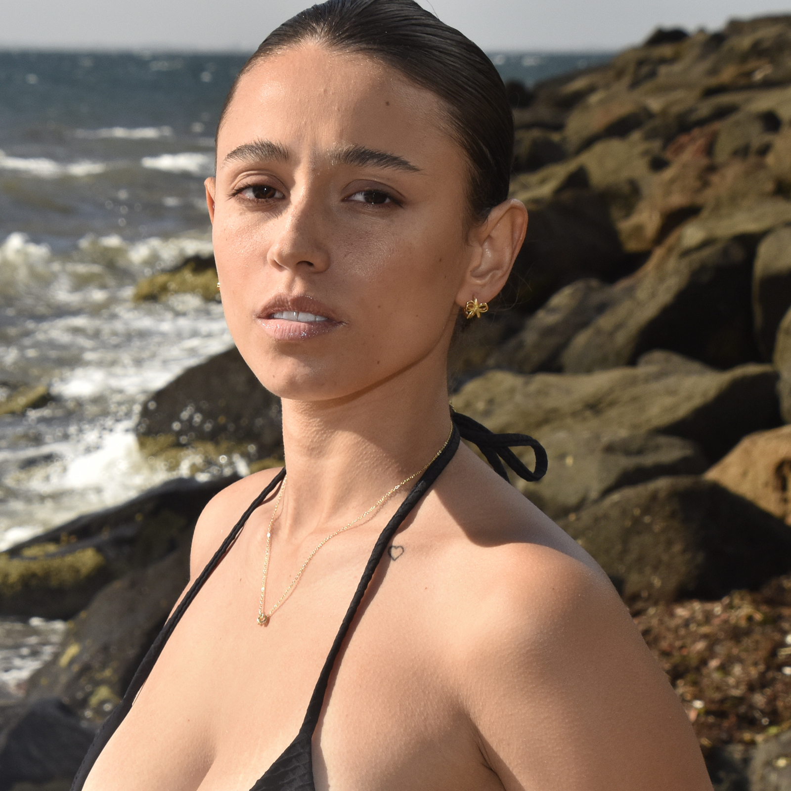 This necklace is 45cm long. Please kindly note that the position of the necklace sitting on your neck can vary from individual to individual depending on your top size. Model is a size 8.