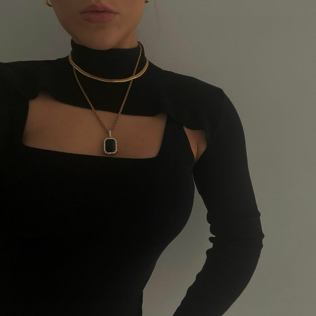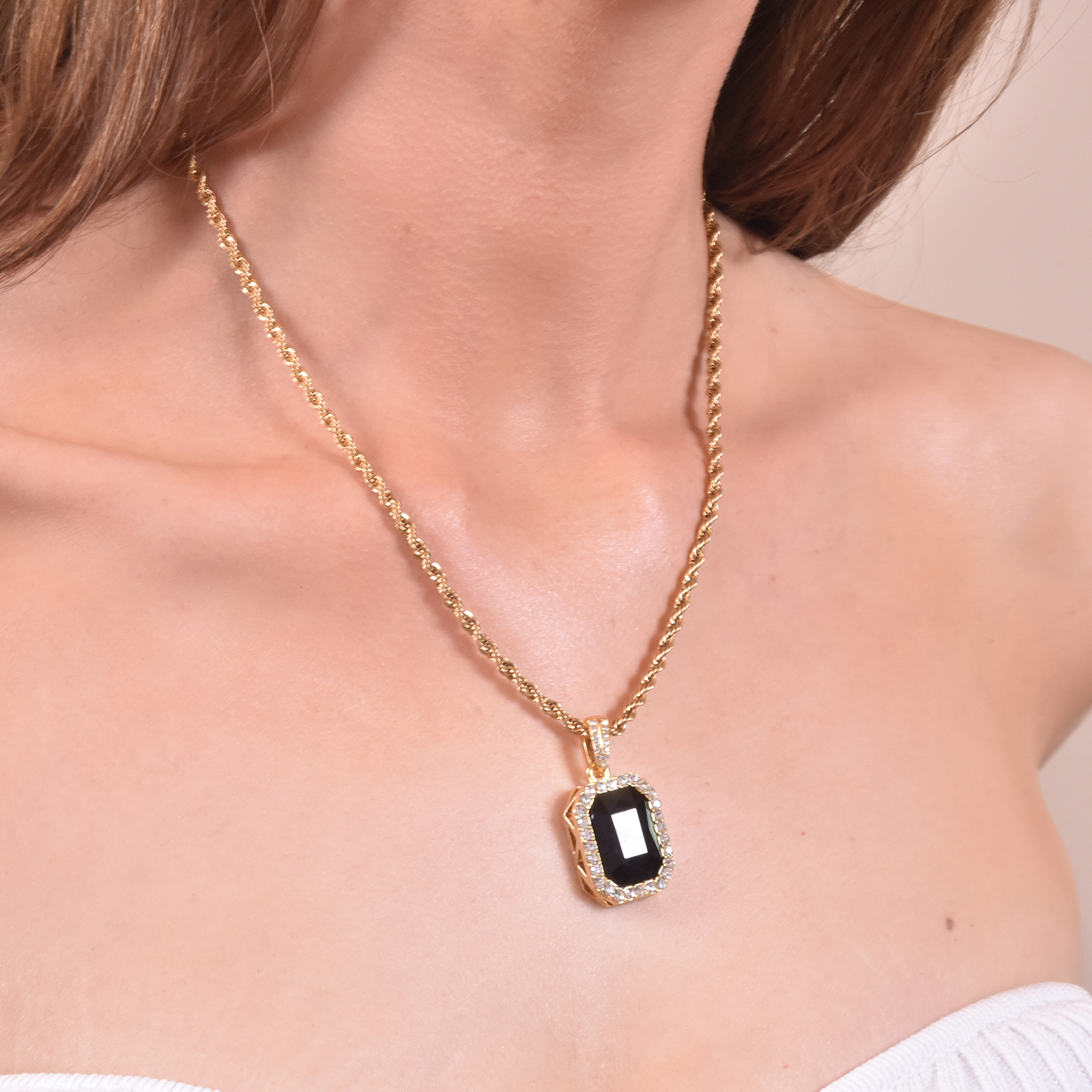 When sassiness dances with boldness. Introducing De Vivre Noir Pendant Necklace — a modern chic neckpiece that advocates a sweet balance between feminine charm and strength. This piece features a trendy twisted DNA chain crafted in environmentally friendly stainless steel (nickel free) with 18K gold plating. It also comes with a black zirconia pendant embellished with a shimmering clear zirconia frame. Perfect for modern, chic, punk, statement, smart casual, casual styles and more.