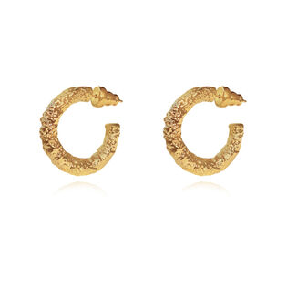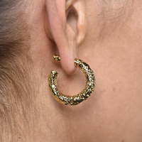 Rawness that does not compromise. Introducing Dejouer 24K Textured C Hoop Earrings - an artisan crafted textured chunky hoop for lovers of uniqueness and rawness. This deign features solid C hoops with a full textured surface. The earrings are made in environmentally friendly brass with 2.5 microns of pure 24K gold plating (heavy gold plated to premium jewellery standards) to ensure hypoallergenic and enduring wear. The earrings are made solid (not hollow) with a quality weight. A unique, artsy and raw statement perfect for contemporary, creative, high fashion, dressy, chic, smart casual, earring layering, casual style and more. Hypoallergenic, nickel, cadmium and lead free.