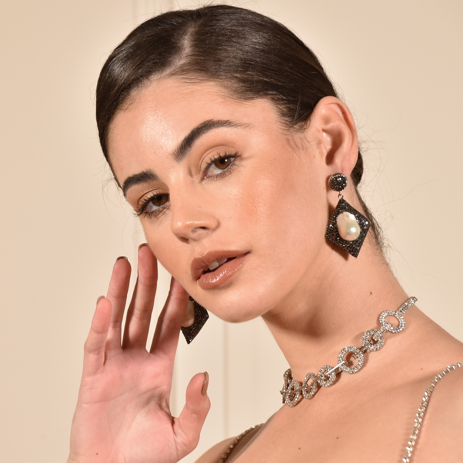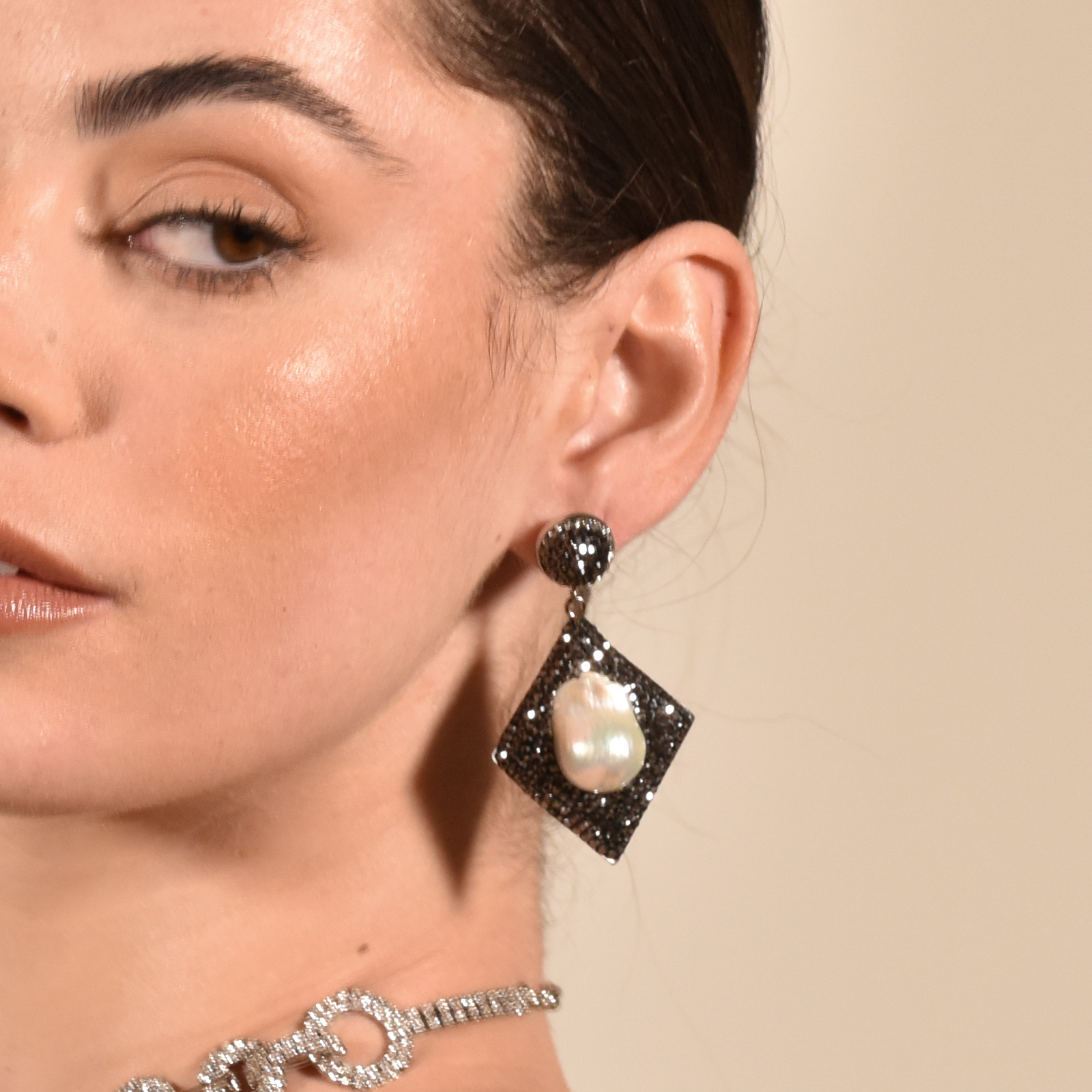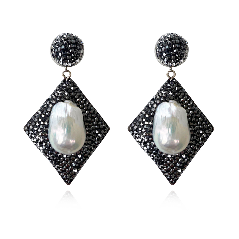 Sold OutHandmade with enriched detail and shimmer. Introducing Desdelina Jewel Embellished Baroque Pearl Earrings - an extravagant natural pearl statement for a glamorous and high fashion touch. This design features natural flared shaped Mediterranean baroque pearls embedded on a diamond shaped hand-laid black cubic zirconia pave frame. The metal base for this earring is environmentally friendly brass with silver plating. A unique and eye-catching earring style for formal, semi-formal, wedding, bridal, dressy, evening, high fashion, creative styling, coastal, smart casual styles and more. Hypoallergenic, nickel, cadmium and lead free.