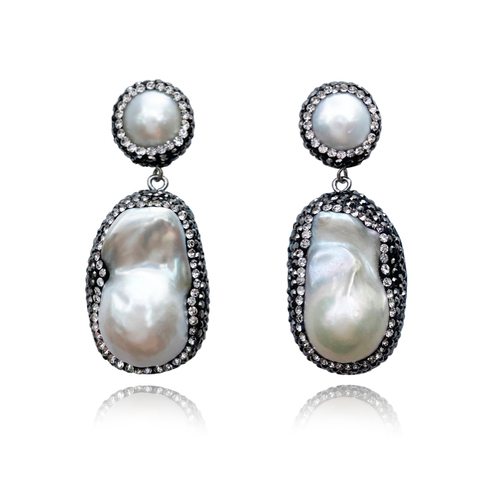 Handmade with exquisiteness. Introducing Desdemona Jewel Embellished Baroque Pearl Earrings - an extravagant big pearl statement for a glamorous and high fashion touch. This design features natural flared shaped Mediterranean baroque pearls and round shaped Mediterranean freshwater pearls. Each pearl is embraced by hand-laid black cubic zirconias, forming a jewel-embellished frame around each pearl. The jewel frame also tailors and compliments the natural shape of the baroque pearls. The metal base for this earring is environmentally friendly brass with silver plating. The earring posts and backings are made of solid sterling silver. A one of a kind earring style for formal, semi-formal, wedding, bridal, dressy, evening, high fashion, creative styling, coastal, smart casual styles and more. Hypoallergenic, nickel, cadmium and lead free.