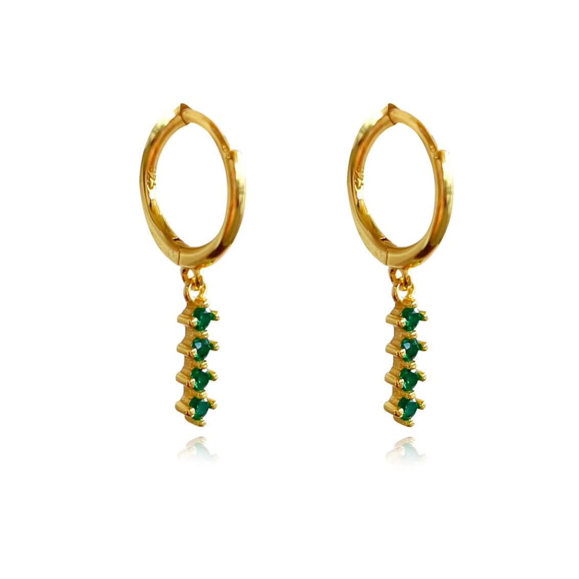 Green is the gaze of loveliness. Introducing Desi Dainty Zircon Drop Earrings (Emerald Green) - a simple and chic bright pop for your effortless everyday styling. This design features a vertical drop of four Austrian green zirconia stones each encased in gold, attached to dainty gold hoops. The earrings are made in solid sterling silver with 18K gold plating for hypoallergenic and enduring wear. Perfect for modern, chic, minimalist, punk, earring layering, smart casual, casual, everyday styles and more. Hypoallergenic, nickel, lead, and cadmium free.