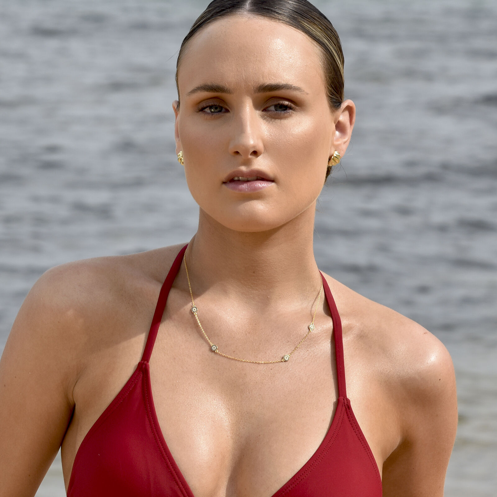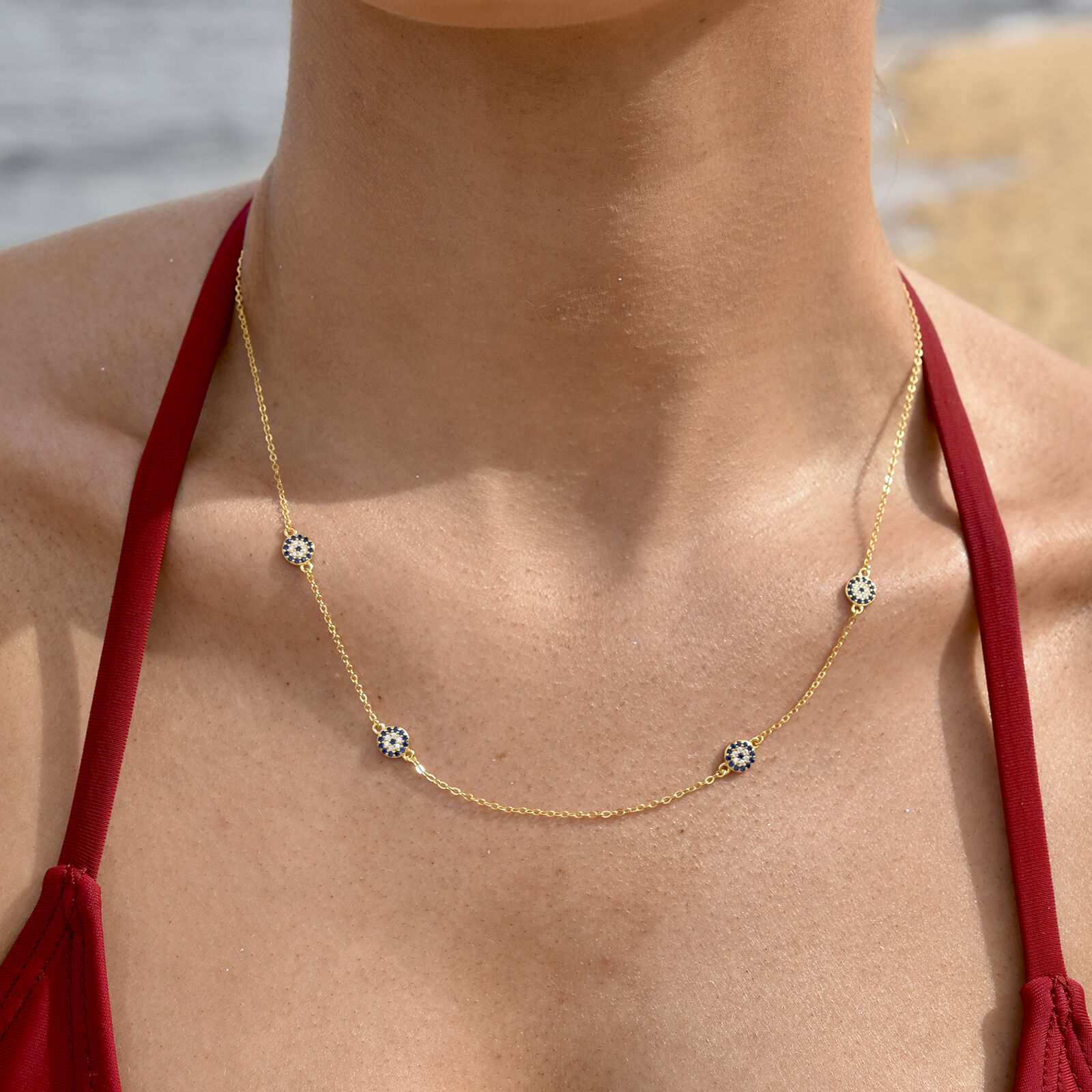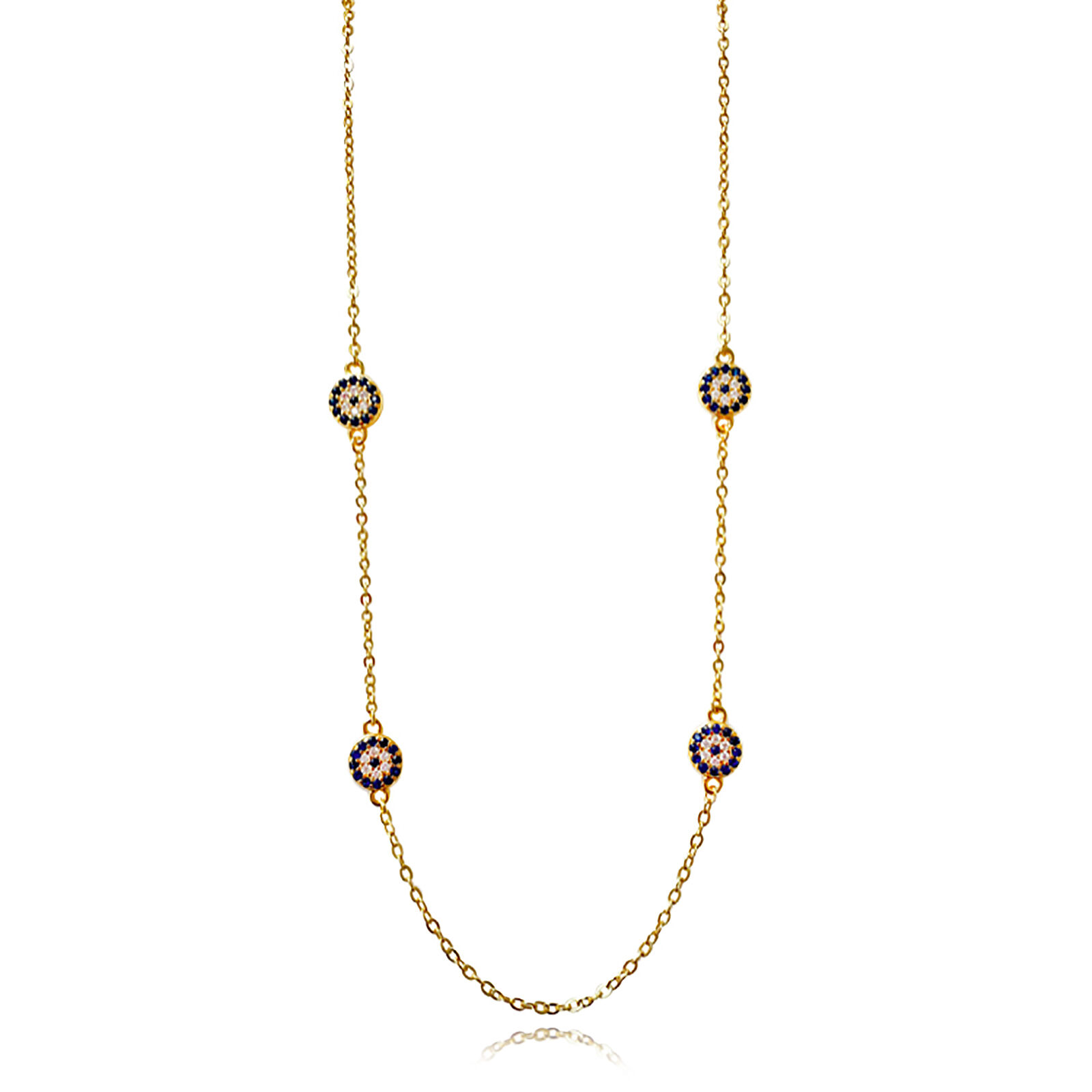 May this evil eye protect you as you go about your day. May happiness surround you and stay out of harm’s way. Introducing Dilara Blue Zircon Evil Eye Necklace (Gold) - a delicate and timeless fine piece featuring four round Austrian blue and clear zircon evil eyes. Each evil eye has a blue zircon in the centre, surrounded by a ring of clear zircons and another ring of blue zircons. This necklace is made in sterling silver with 18ct gold plating for enduring and hypoallergenic everyday wear. Perfect for layering and all personal styles, and especially for evil eye lovers. This necklace is 45.5cm long including a 5.5cm adjustable link for a more flexible personal fit. Hypoallergenic, nickel, lead, and cadmium free. Available in 18ct gold or silver.