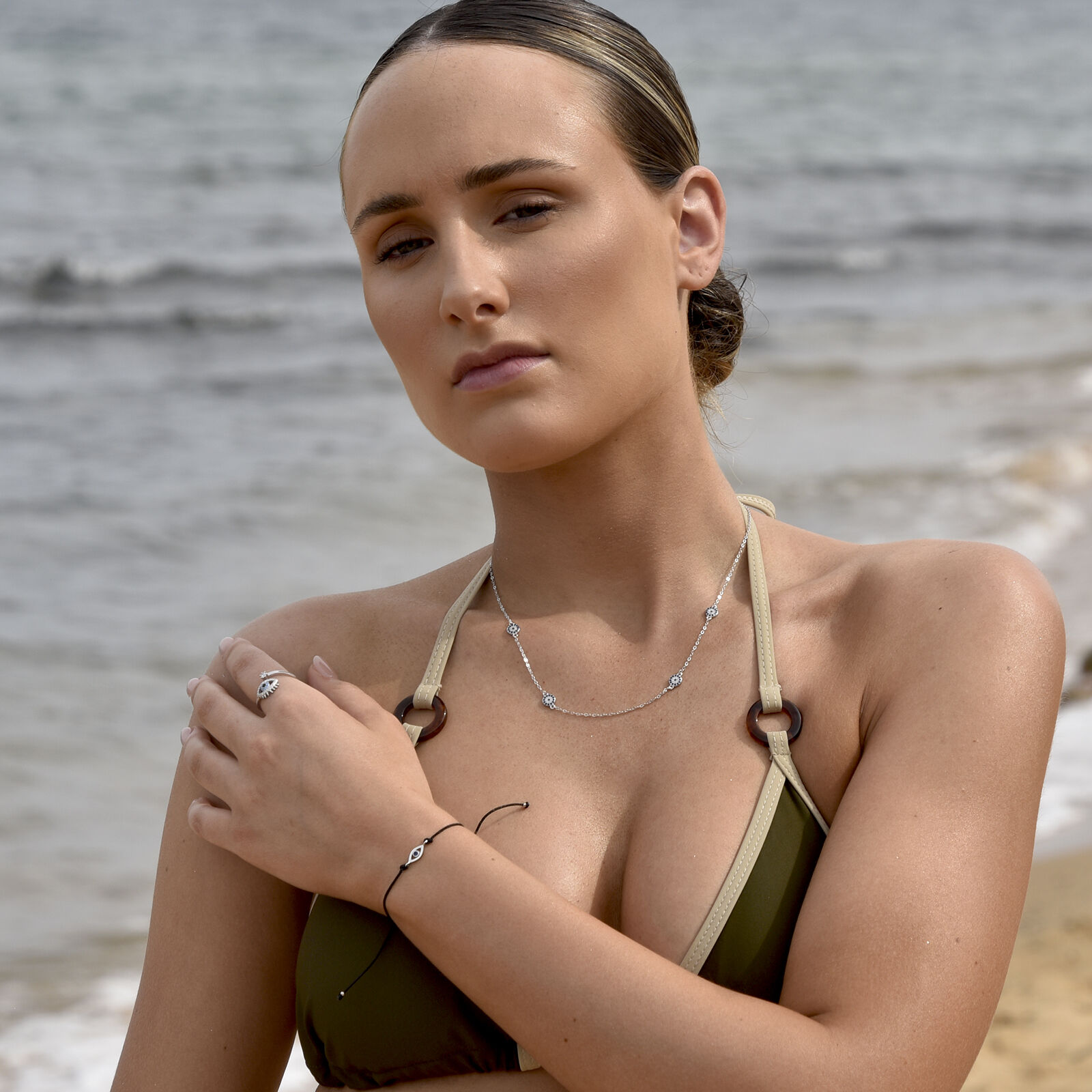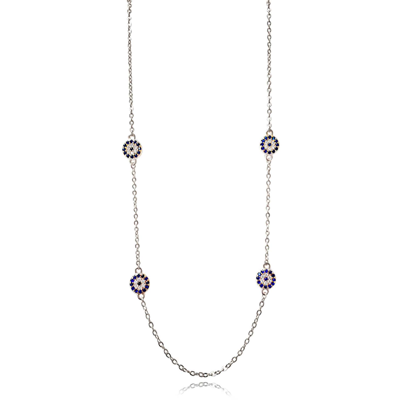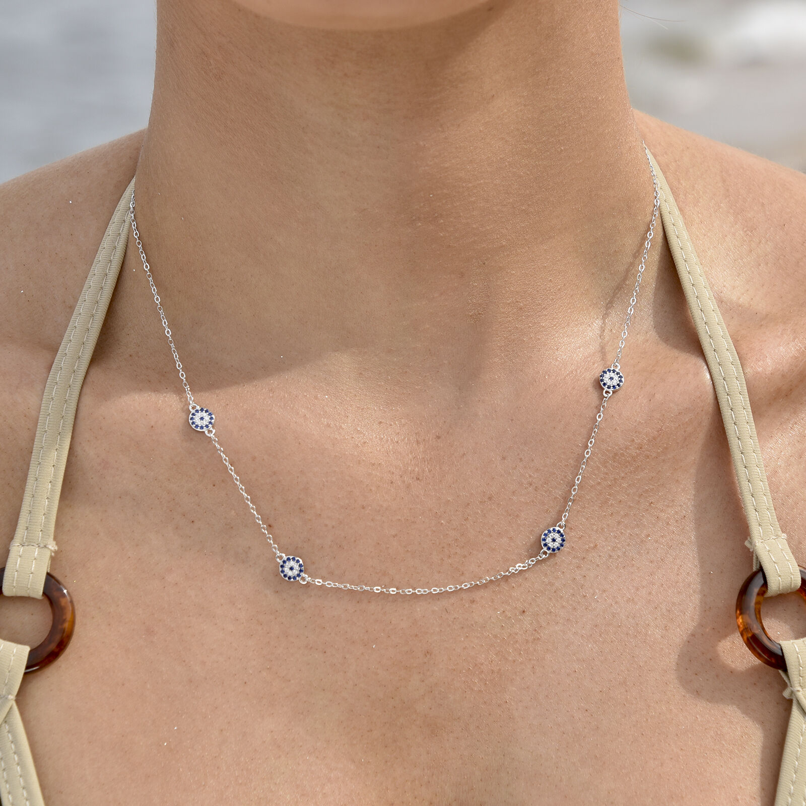 May this evil eye protect you as you go about your day. May happiness surround you and stay out of harm’s way. Introducing Dilara Blue Zircon Evil Eye Necklace (Silver) - a delicate and timeless fine piece featuring four round Austrian blue and clear zircon evil eyes. Each evil eye has a blue zircon in the centre, surrounded by a ring of clear zircons and another ring of blue zircons. This necklace is made in sterling silver plating for enduring and hypoallergenic everyday wear. Perfect for layering and all personal styles, and especially for evil eye lovers. This necklace is 45.5cm long including a 5.5cm adjustable link for a more flexible personal fit. Hypoallergenic, nickel, lead, and cadmium free. Available in 18ct gold or silver.