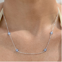 May this evil eye protect you as you go about your day. May happiness surround you and stay out of harm’s way. Introducing Dilara Blue Zircon Evil Eye Necklace (Silver) - a delicate and timeless fine piece featuring four round Austrian blue and clear zircon evil eyes. Each evil eye has a blue zircon in the centre, surrounded by a ring of clear zircons and another ring of blue zircons. This necklace is made in sterling silver plating for enduring and hypoallergenic everyday wear. Perfect for layering and all personal styles, and especially for evil eye lovers. This necklace is 45.5cm long including a 5.5cm adjustable link for a more flexible personal fit. Hypoallergenic, nickel, lead, and cadmium free. Available in 18ct gold or silver.
